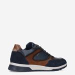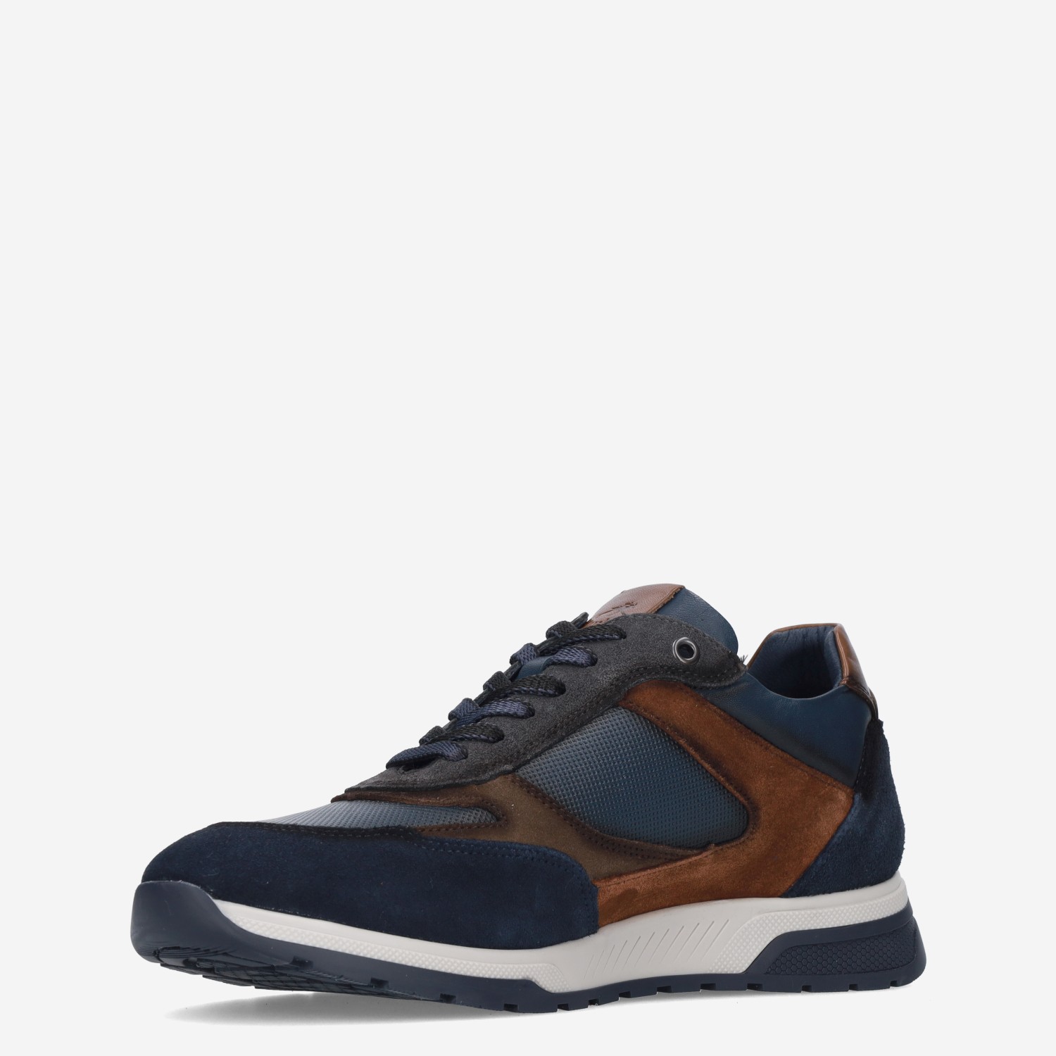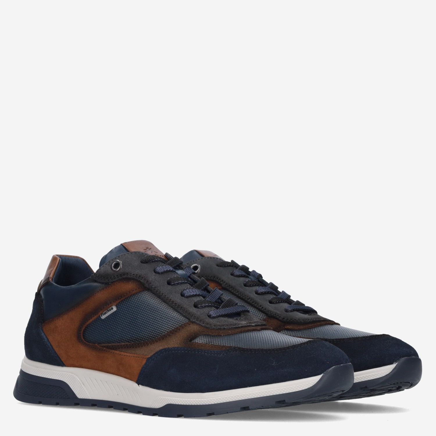 Deze donker blauw met bruine Afelcado herenschoen van Fluchos is gemaakt van hoogwaardig leer in combinatie met textiel. De stijlvolle sneaker is voorzien van verschillende overlays.