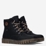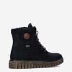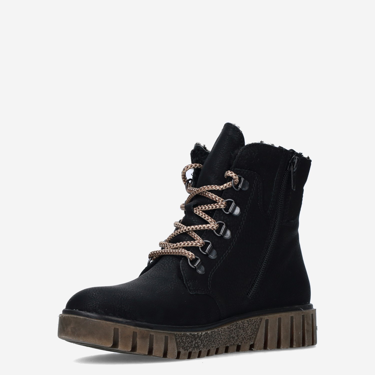 Deze zwarte Ambor damesschoen van Rieker is gemaakt van hoogwaardig imitatieleer in combinatie met synthetische materialen. De boot is voorzien van zowel een rits- als vetersluiting voor een gemakkelijke instap.