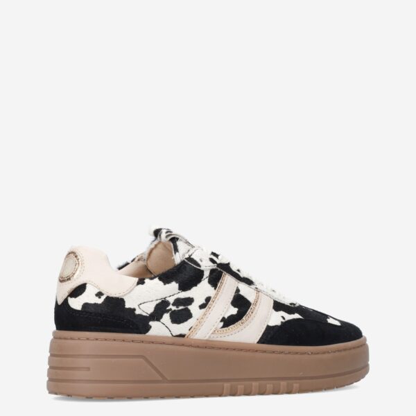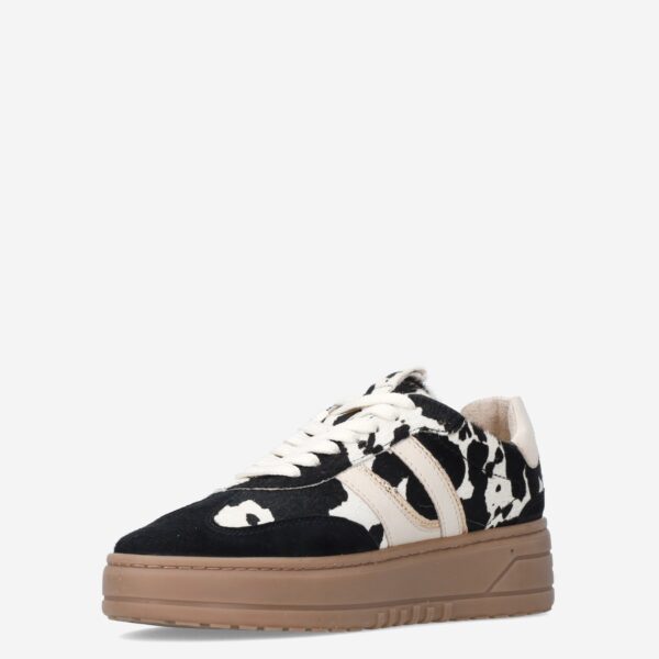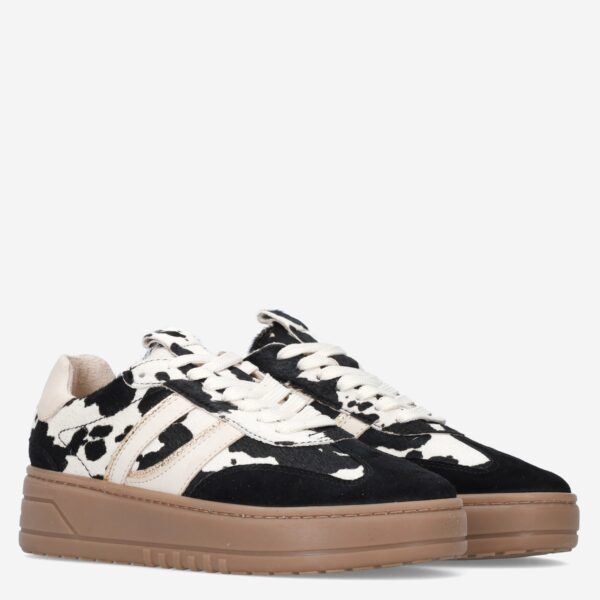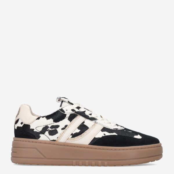 Deze zwart met witte Anemone damessneaker van Poelman is gemaakt van leer in combinatie met textiel. De sneaker is voorzien van een toffe animalprint.