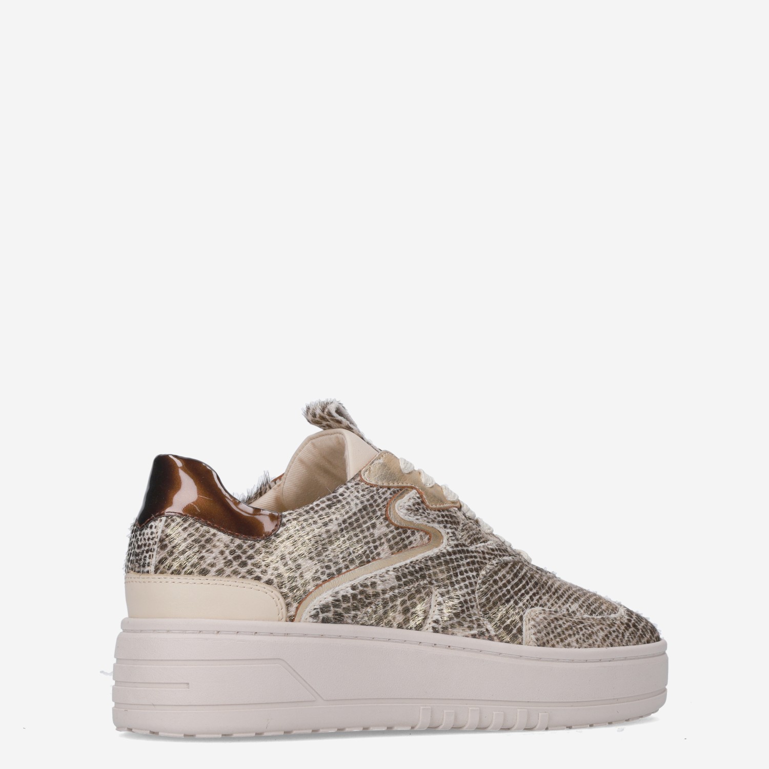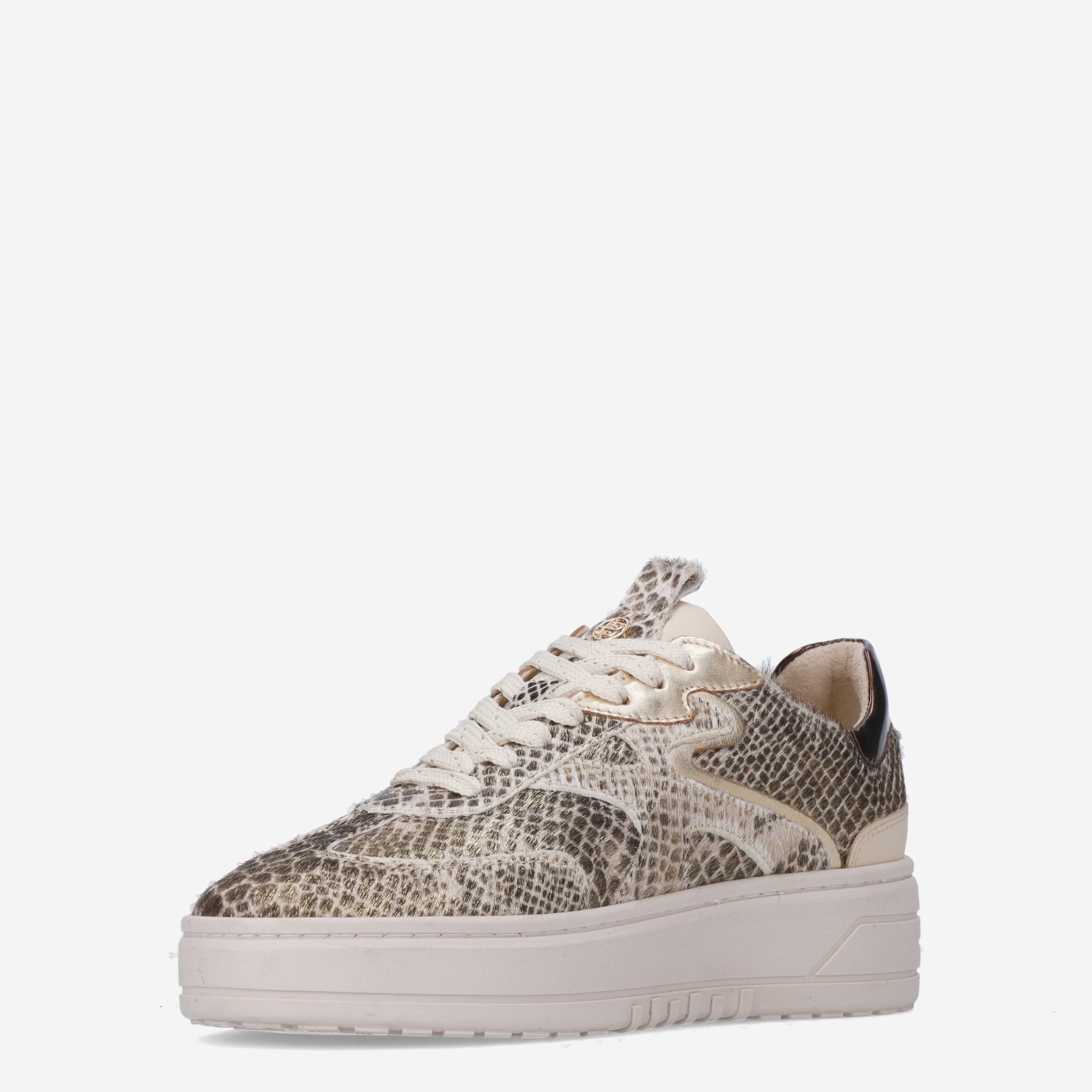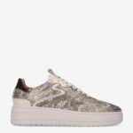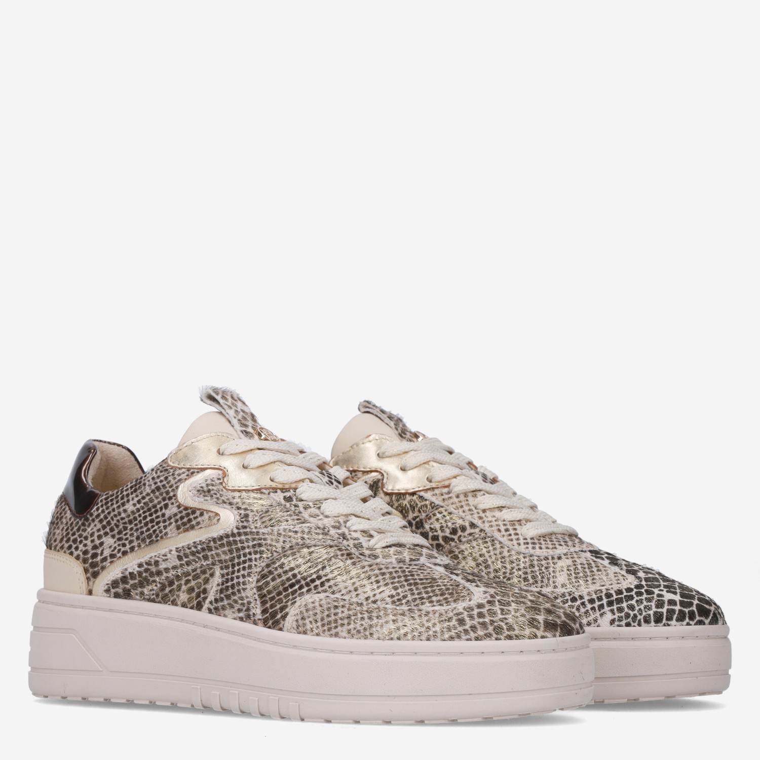 Deze beige, gouden Annemone damessneaker van HABOOB is gemaakt van leer in combinatie met textiel en synthetische materialen. De sneaker is voorzien van een stevige loopzool en heeft een slangenprint design van ponyhair.