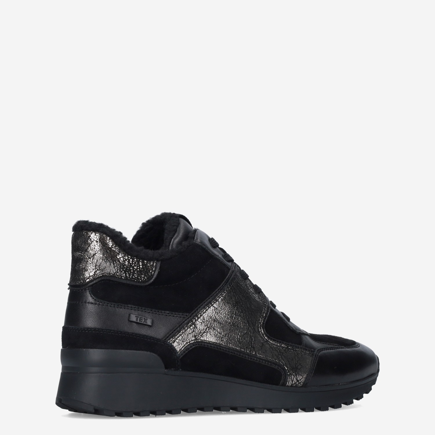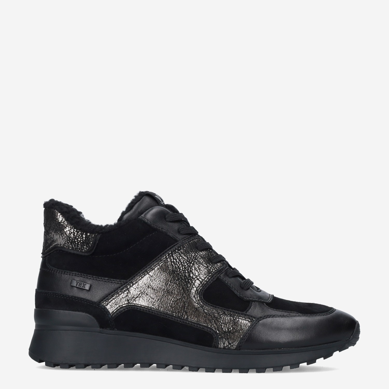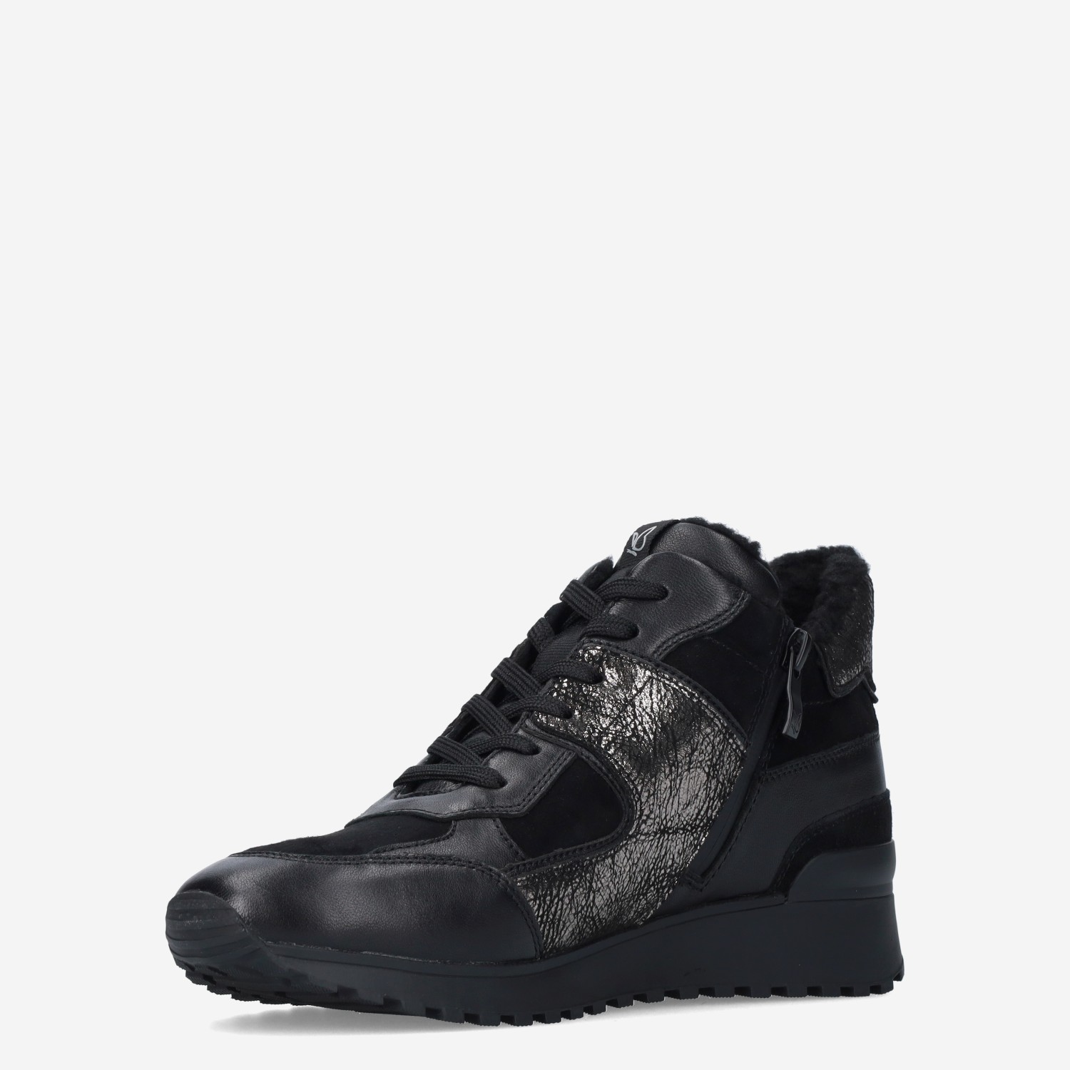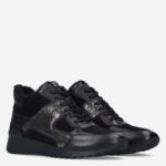 Deze hoge zwarte Boot C damesschoen van Caprice is gemaakt van leer in combinatie met synthetische materialen. De enkelsneaker is voorzien van zowel een rits- als vetersluiting en heeft metallic accenten.