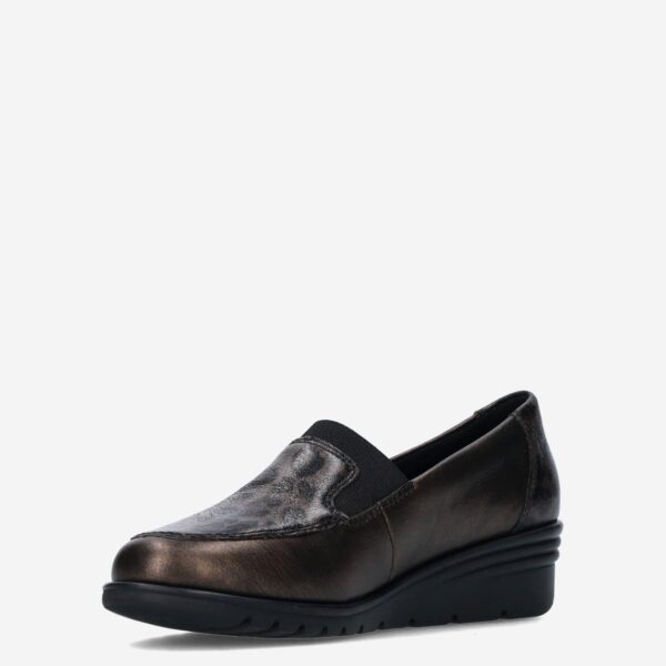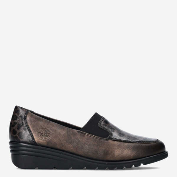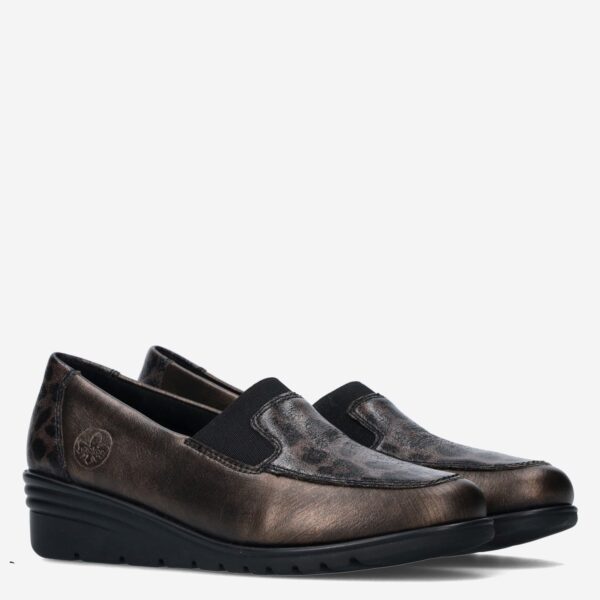 Deze bruine metallic Bosra Leprato damesinstapper van Rieker is gemaakt van imitatieleer in combinatie met synthetische materialen. De loafer is voorzien van elastieken inzetstukken voor een gemakkelijke instap en heeft een panterprint design.