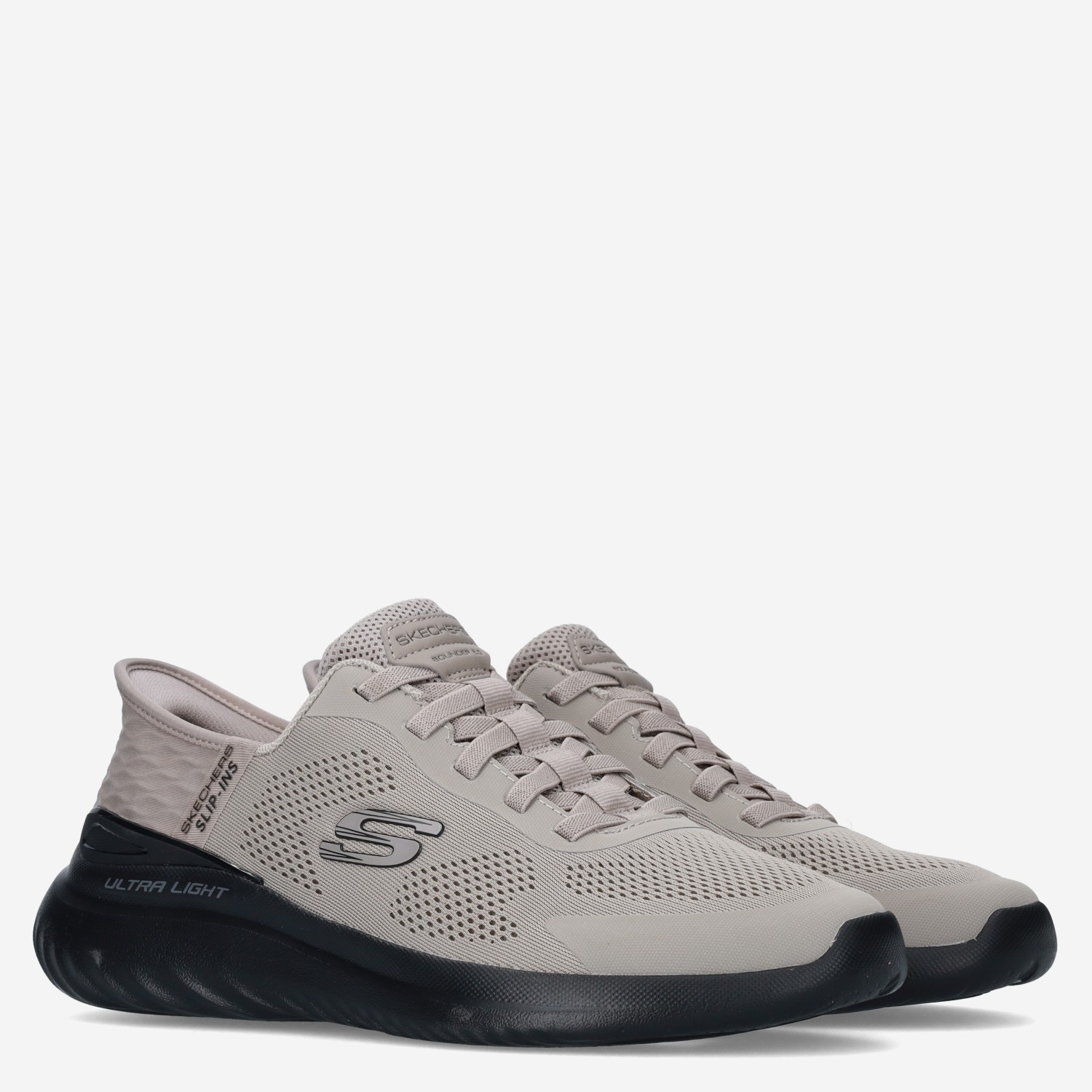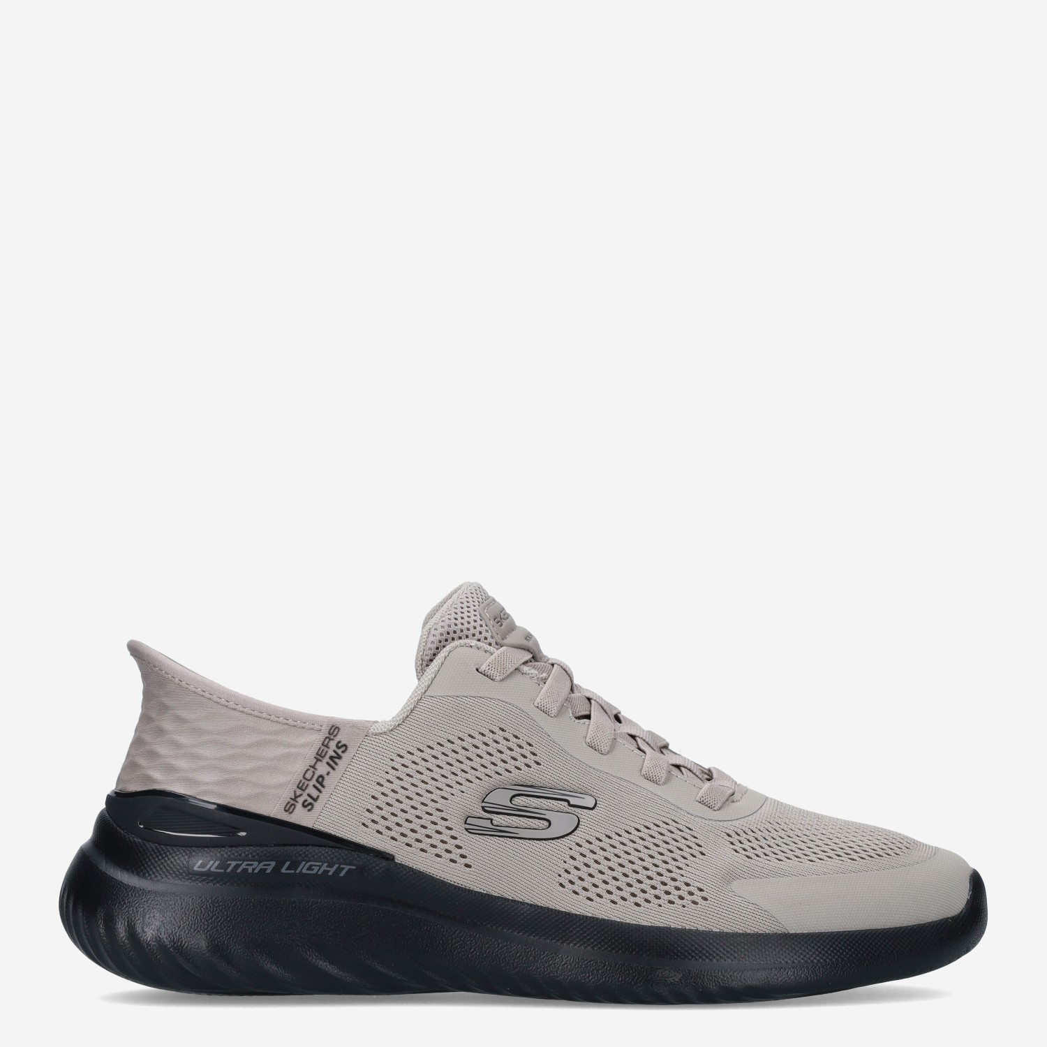 Deze grijs met zwarte Bounder 2.0 Slip-In herenschoen van Skechers is gemaakt van textiel in combinatie met synthetische materialen. De instapper is voorzien van een gevormd Skechers Slip-insยฎ hakpaneel en een dempende Skechers Air-Cooled Memory Foamโ„ข binnenzool.