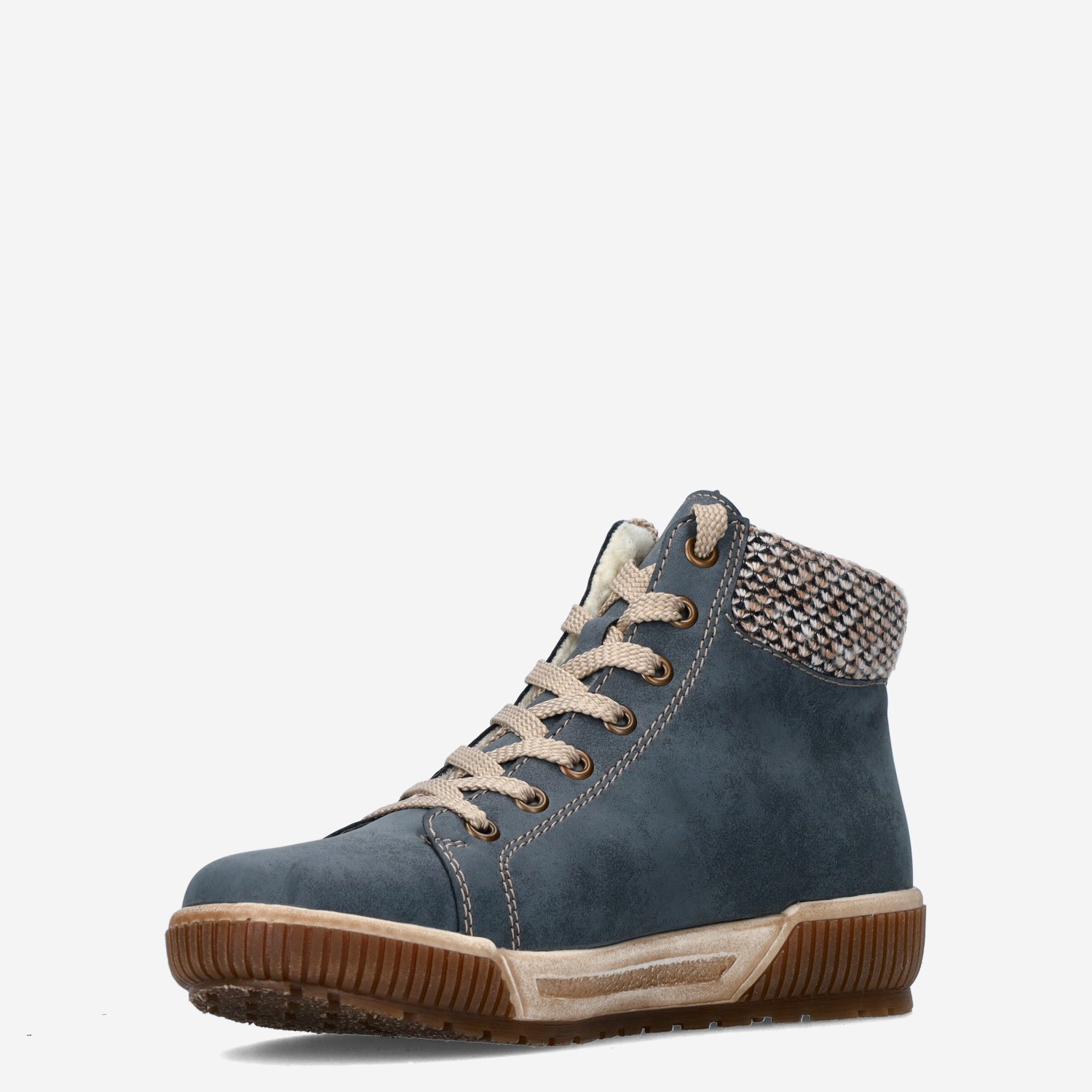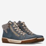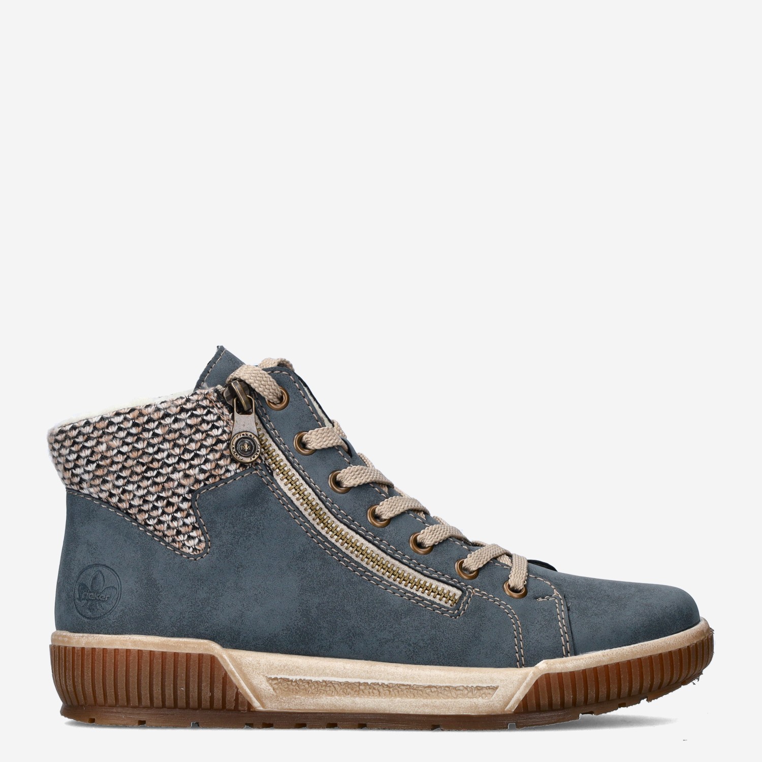 Deze blauwe Brasilia Leeds damessneaker van Rieker is gemaakt van imitatieleer in combinatie met synthetische materialen. De hoge sneaker is voorzien van zowel een veter- als ritssluiting voor een gemakkelijke instap en heeft een gebreid bovenwerk.