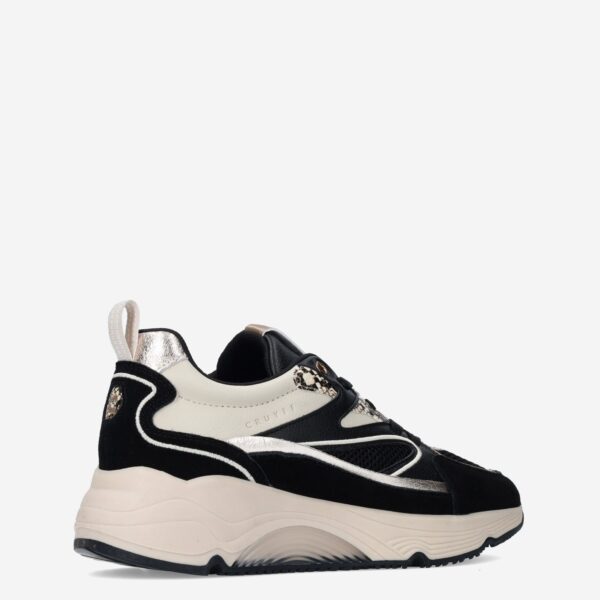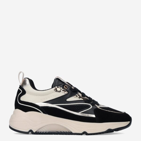 Deze zwarte Madina damessneaker van Cruyff is gemaakt van verschillende leersoorten in combinatie met synthetische materialen en is voorzien van metallic accenten.