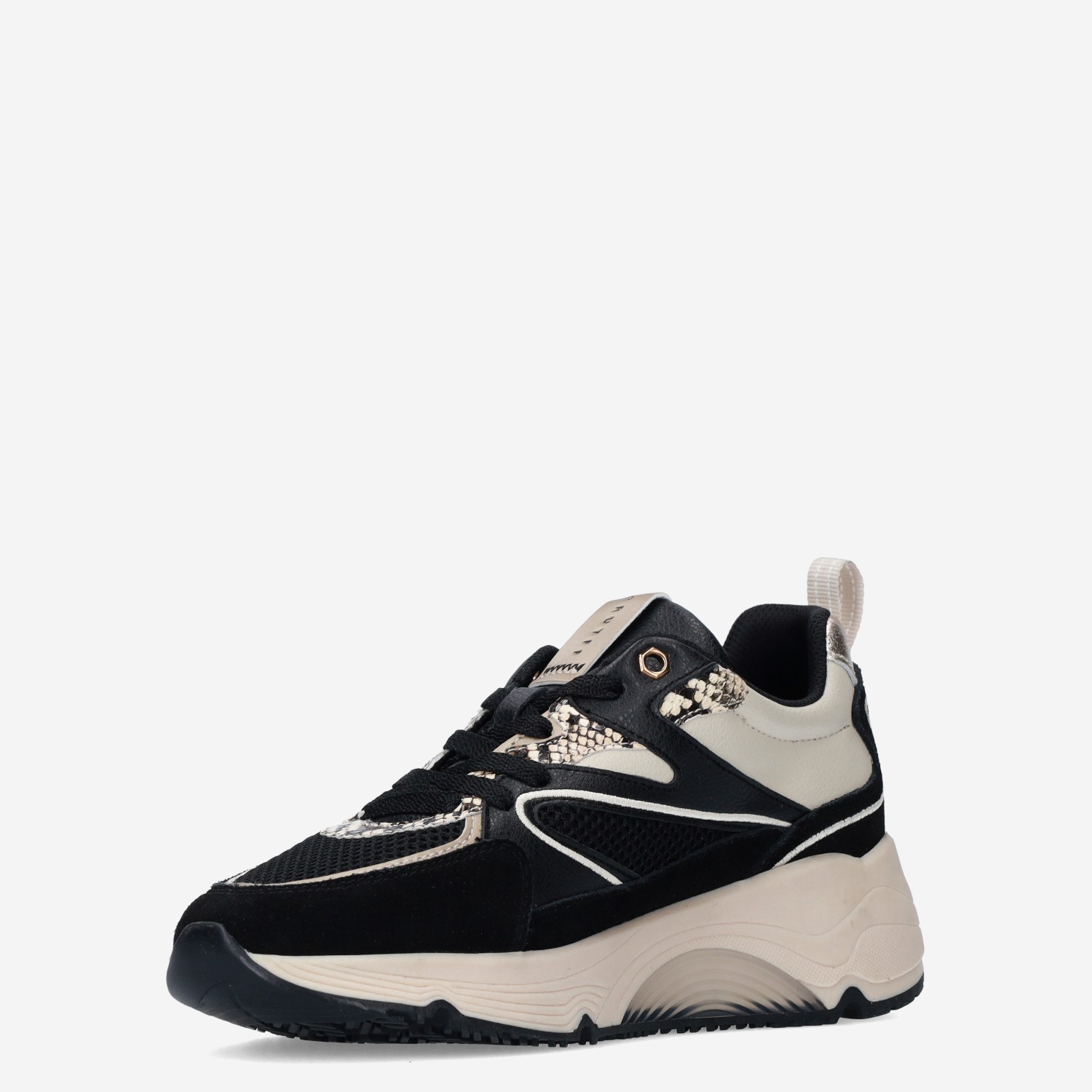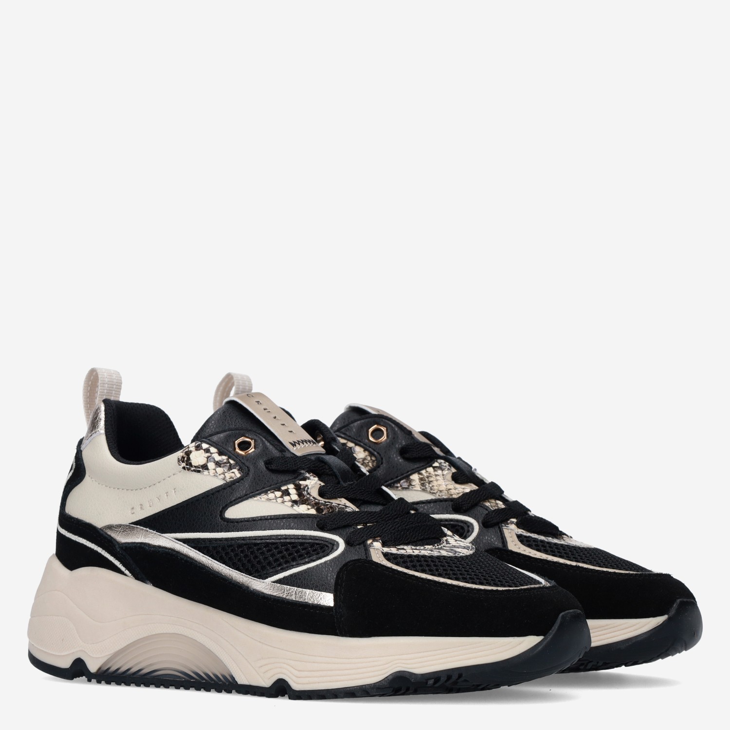 Deze zwarte Madina damessneaker van Cruyff is gemaakt van verschillende leersoorten in combinatie met synthetische materialen en is voorzien van metallic accenten.