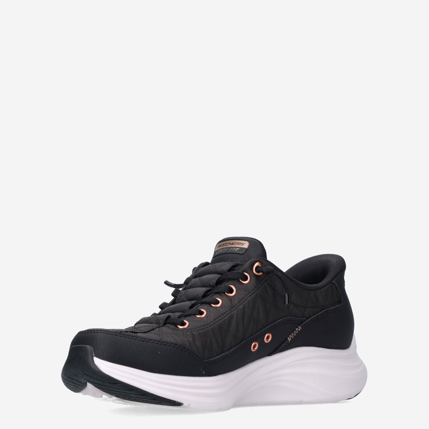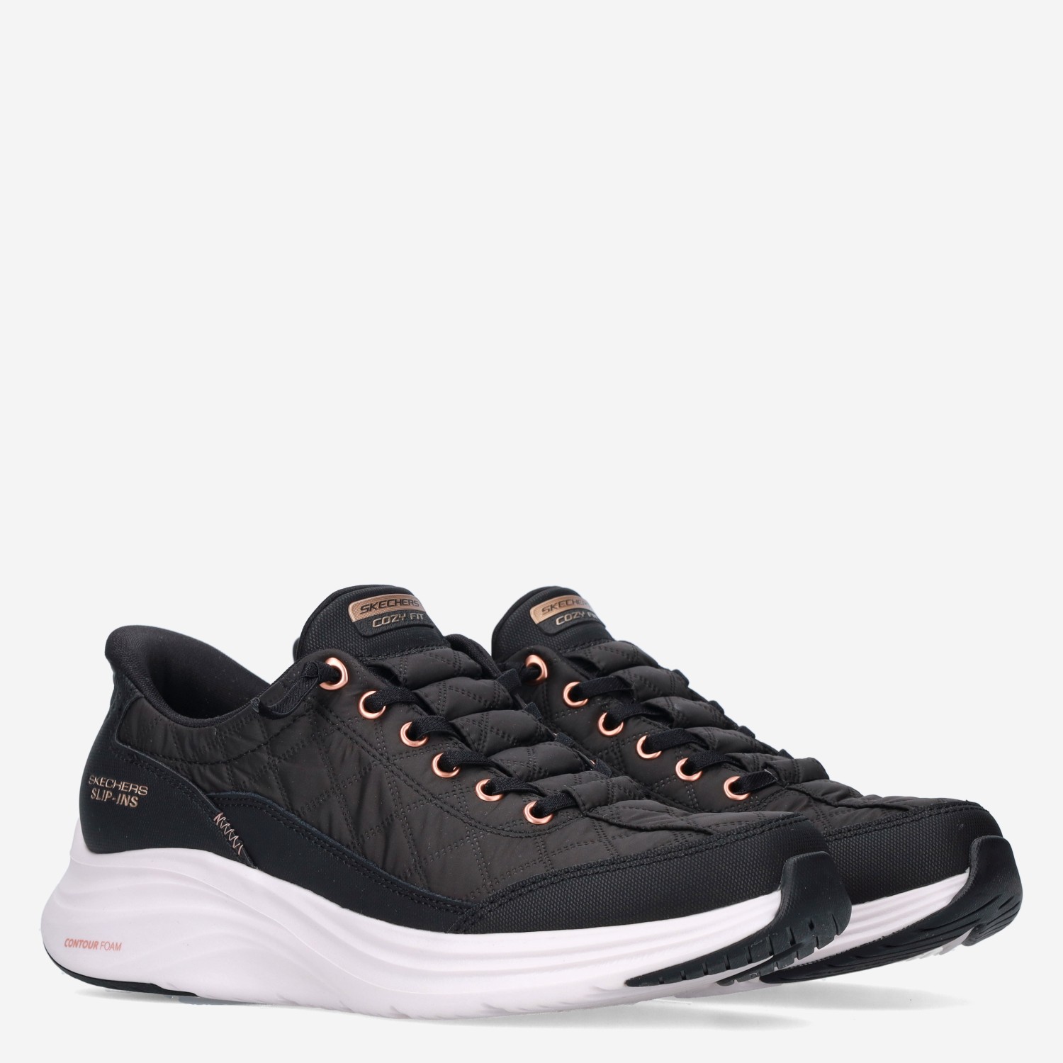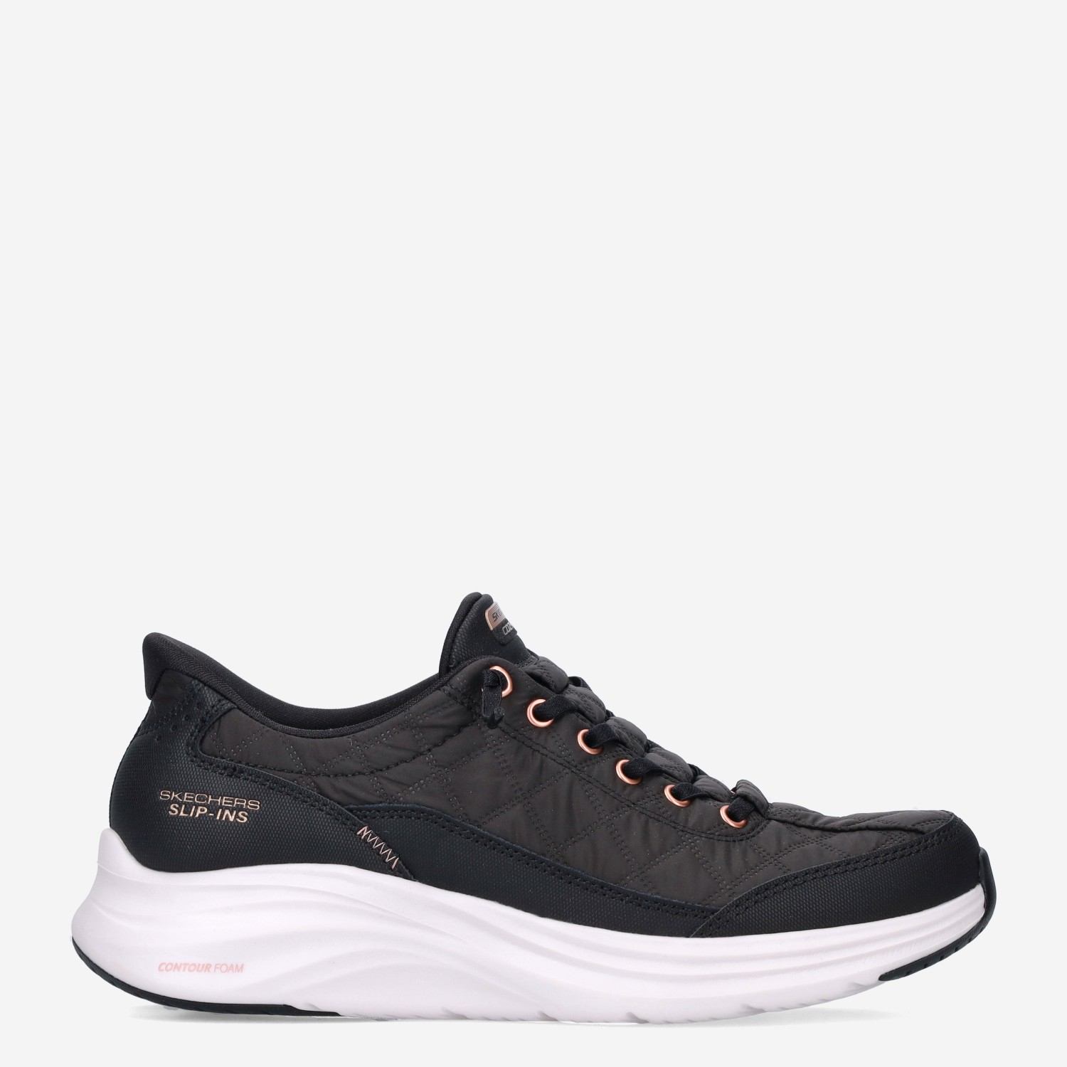 Deze zwarte Contour Foam Slip-In damessneaker van Skechers is gemaakt van textiel in combinatie met synthetische materialen. De instapper is voorzien van een verstevigde hiel en heeft een superlichte tussenzool van Contour Foam die zich aanpast aan de unieke vorm van je voet en zo elke stap verzacht.