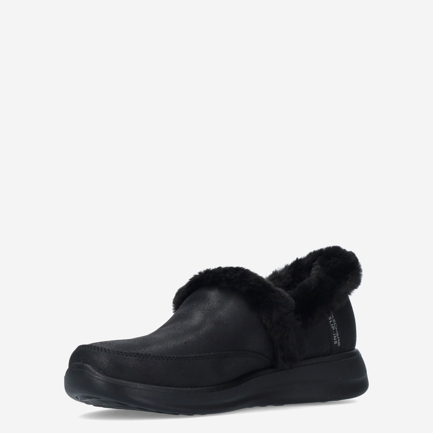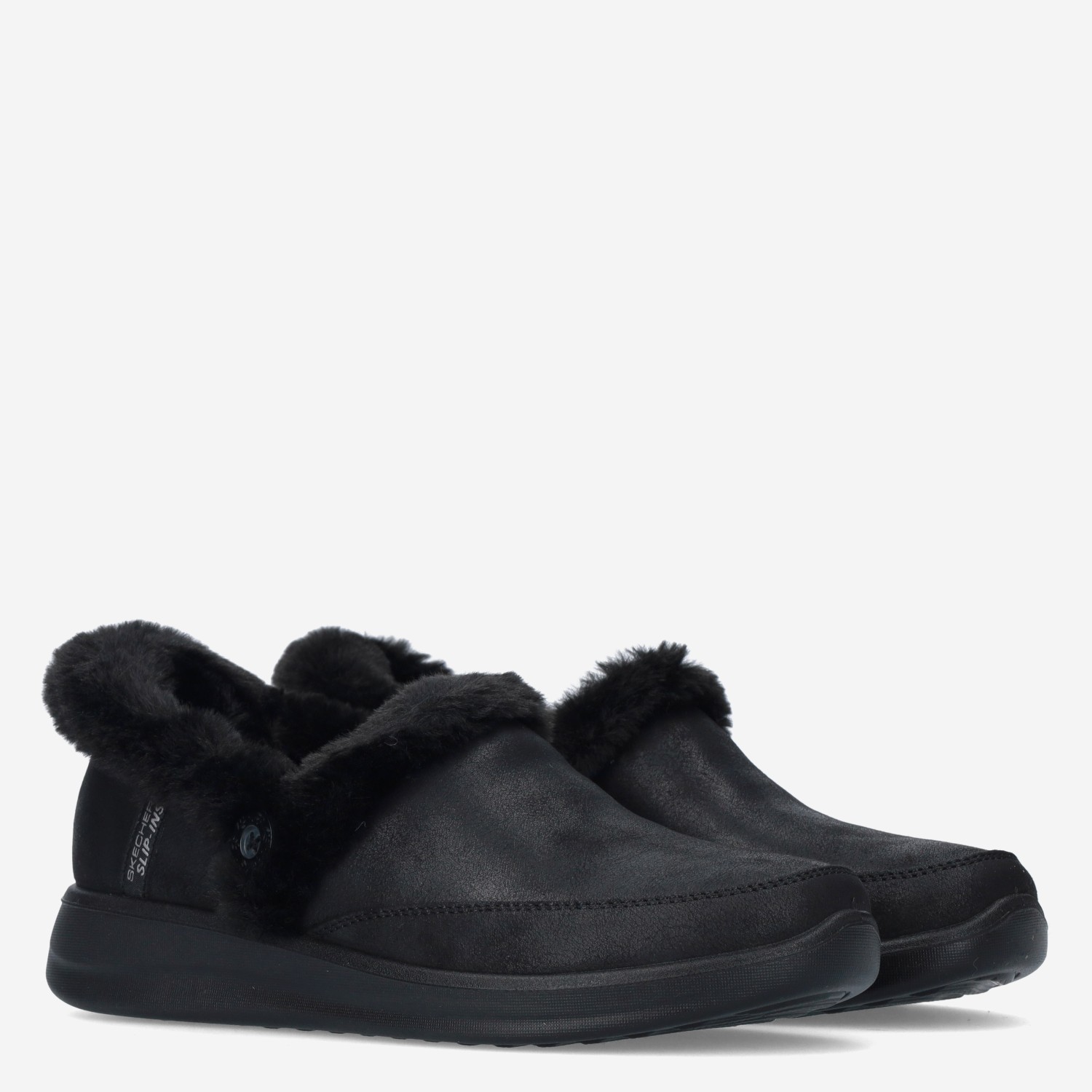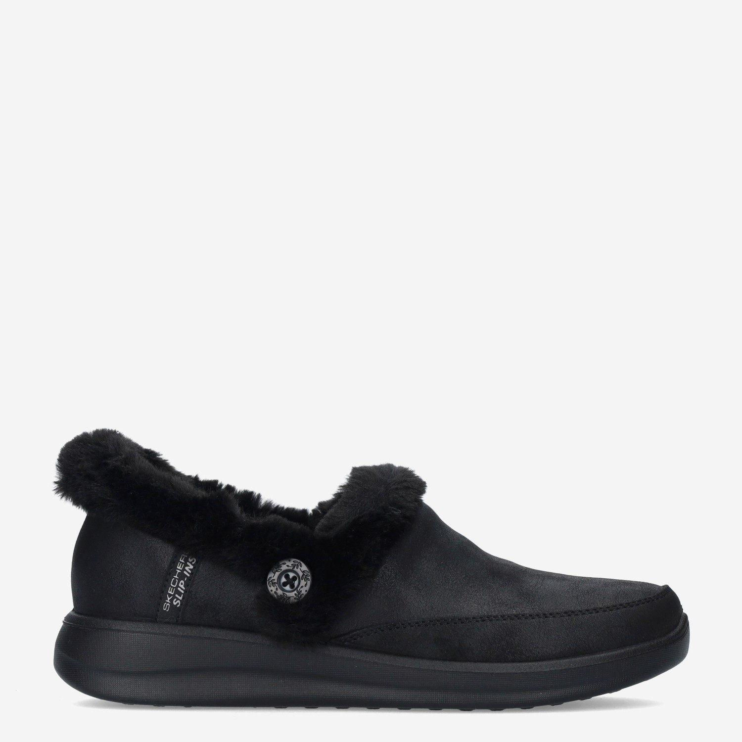 Deze zwarte Cozy Escape damespantoffel van Skechers is gemaakt van textiel in combinatie met synthetische materialen. Deze warme slof is voorzien van een zachte binnenvoering en heeft een gemakkelijke instap.