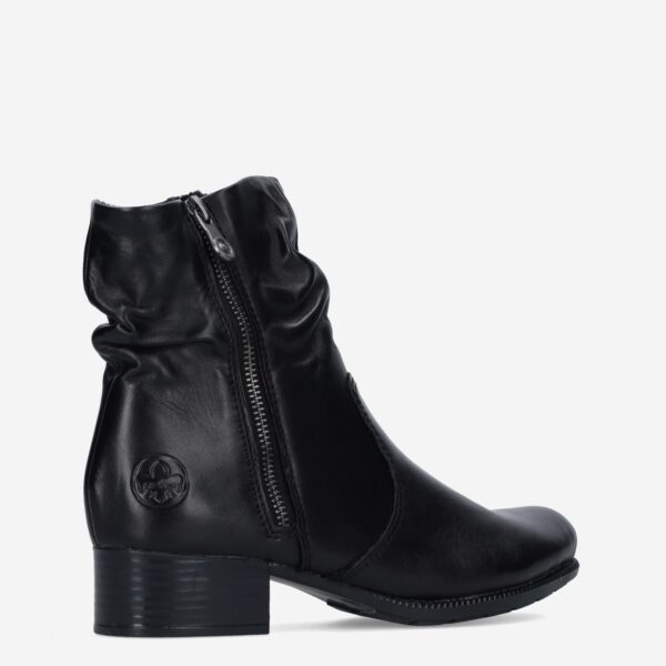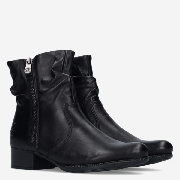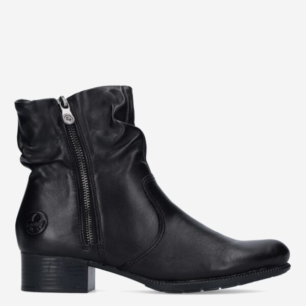Deze zwarte Cristallino damesboot van Rieker is gemaakt van leer in combinatie met synthetische materialen. De enkellaars is voorzien van een dubbele ritssluiting voor een gemakkelijke instap en heeft een hakhoogte van ongeveer 3 centimeter.