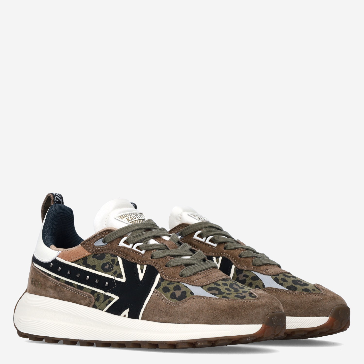 Deze groen met bruine multicoloured Detroit Glam damessneaker van Kaotiko is gemaakt van leer in combinatie met textiel. De sportieve sneaker is voorzien van een fijne loopzool die voor voldoende demping zorgt.