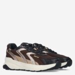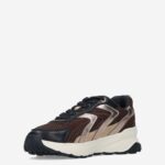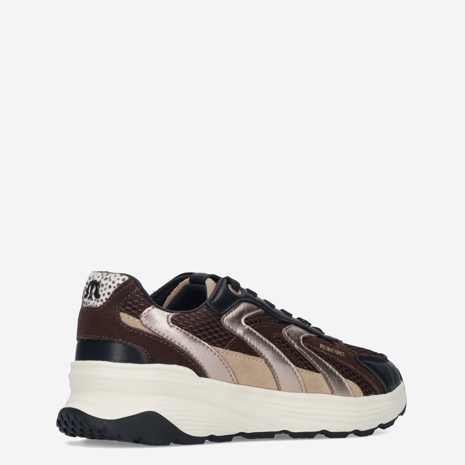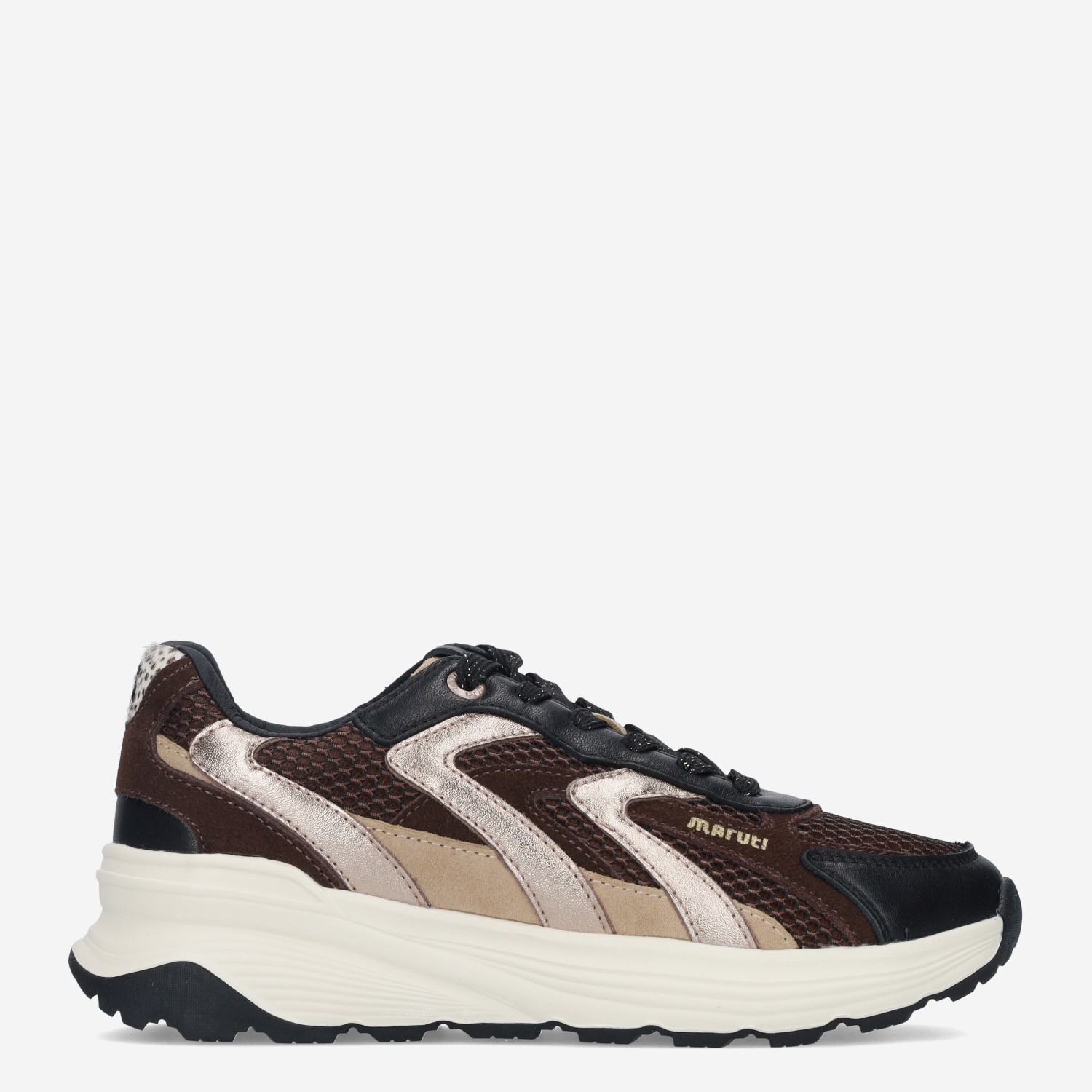 Deze donker bruin met zwarte metallic Dora damessneaker van Maruti is gemaakt van leer in combinatie met mesh.