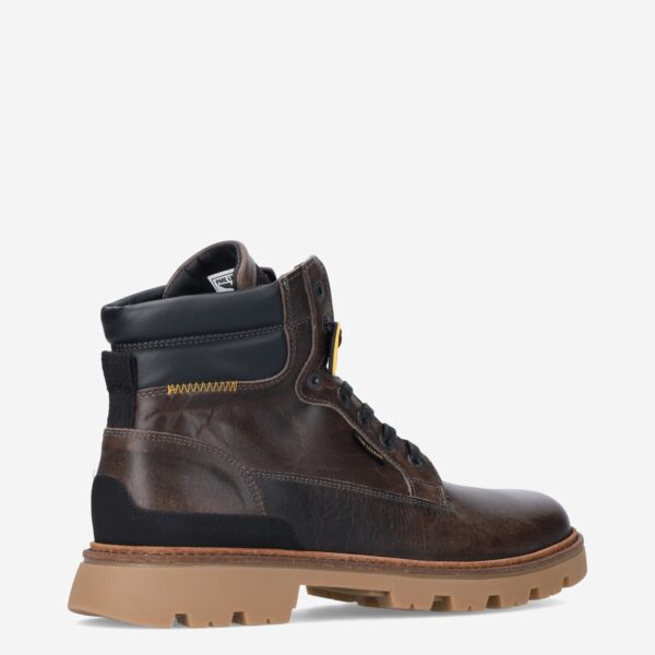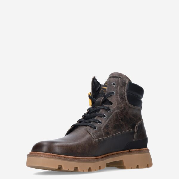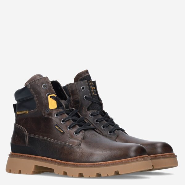 Deze bruine Dragan herenboot van PME Legend is gemaakt van verschillende leersoorten in combinatie met textiel. De stoere veterboot is voorzien van een stevige loopzool met grof profiel.