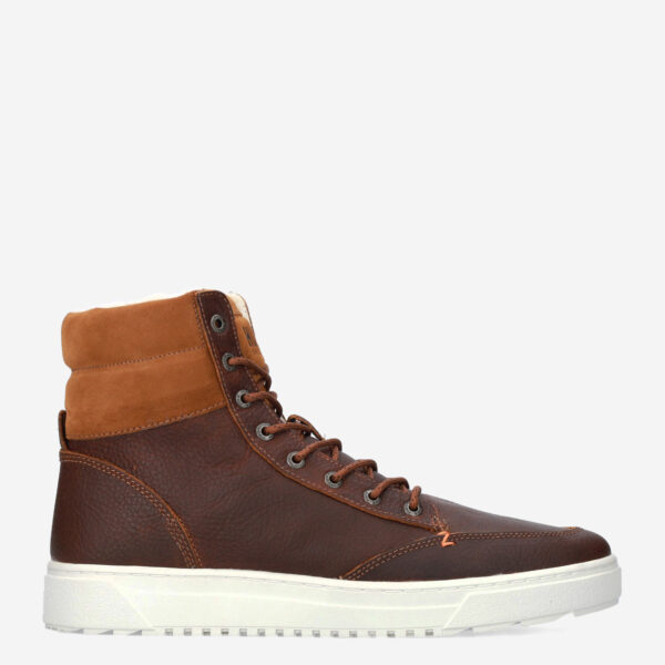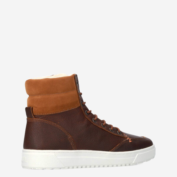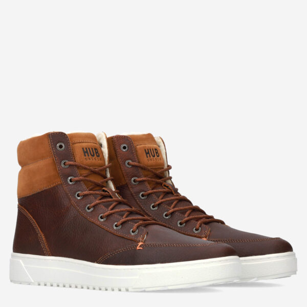 Deze bruine Dublin 2.0 herensneaker van HUB is gemaakt van leer in combinatie met textiel en synthetische materialen. De hoge sneaker is voorzien van een warme binnenvoering van wol en is daardoor zeer geschikt voor de koudere dagen.