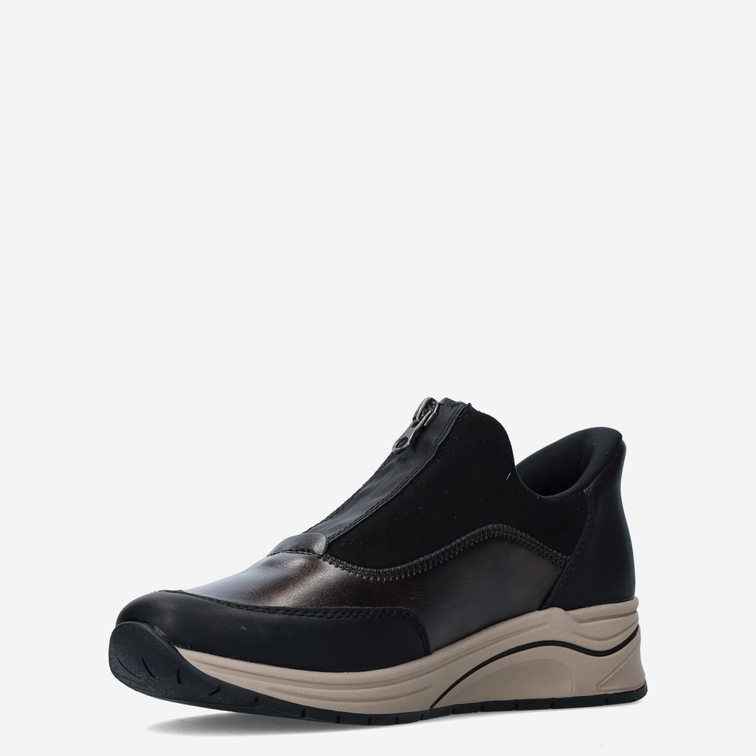 Deze zwarte France damessneaker van Rieker is gemaakt van imitatieleer in combinatie met textiel en synthetische materialen. De stijlvolle sneaker is voorzien van een ritssluiting voor een gemakkelijke instap en is voorzien van metallic accenten.