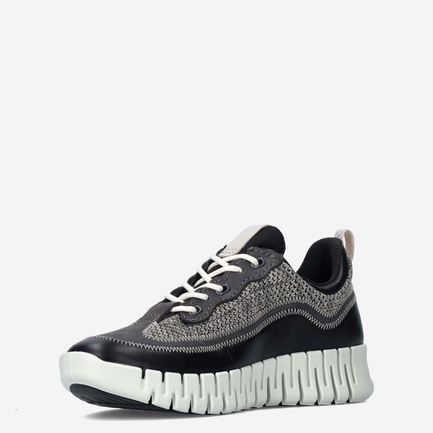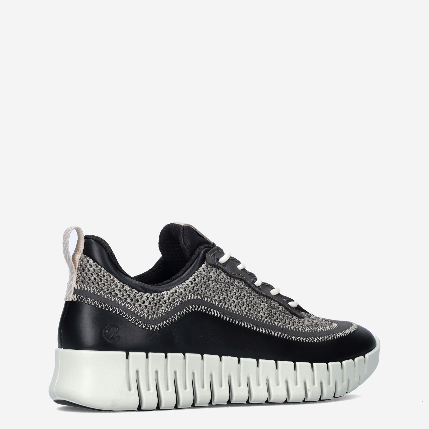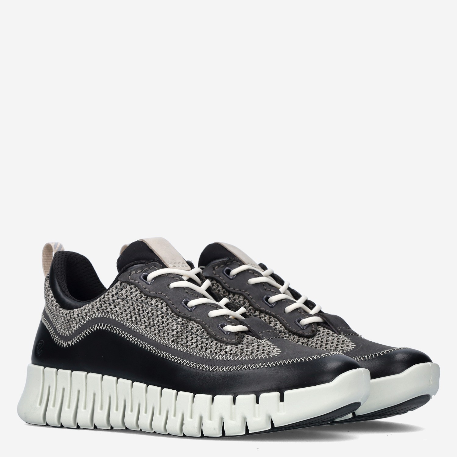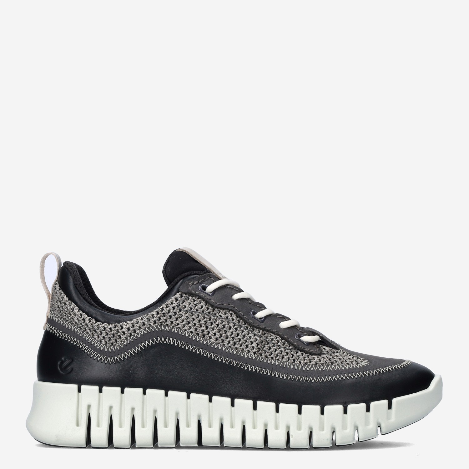 Deze zwarte Gruuv W Black damesschoen van ECCO is gemaakt van hoogwaardig textiel in combinatie met synthetische materialen. De sneaker is voorzien van een comfortabele loopzool en gebreid bovenwerk.