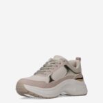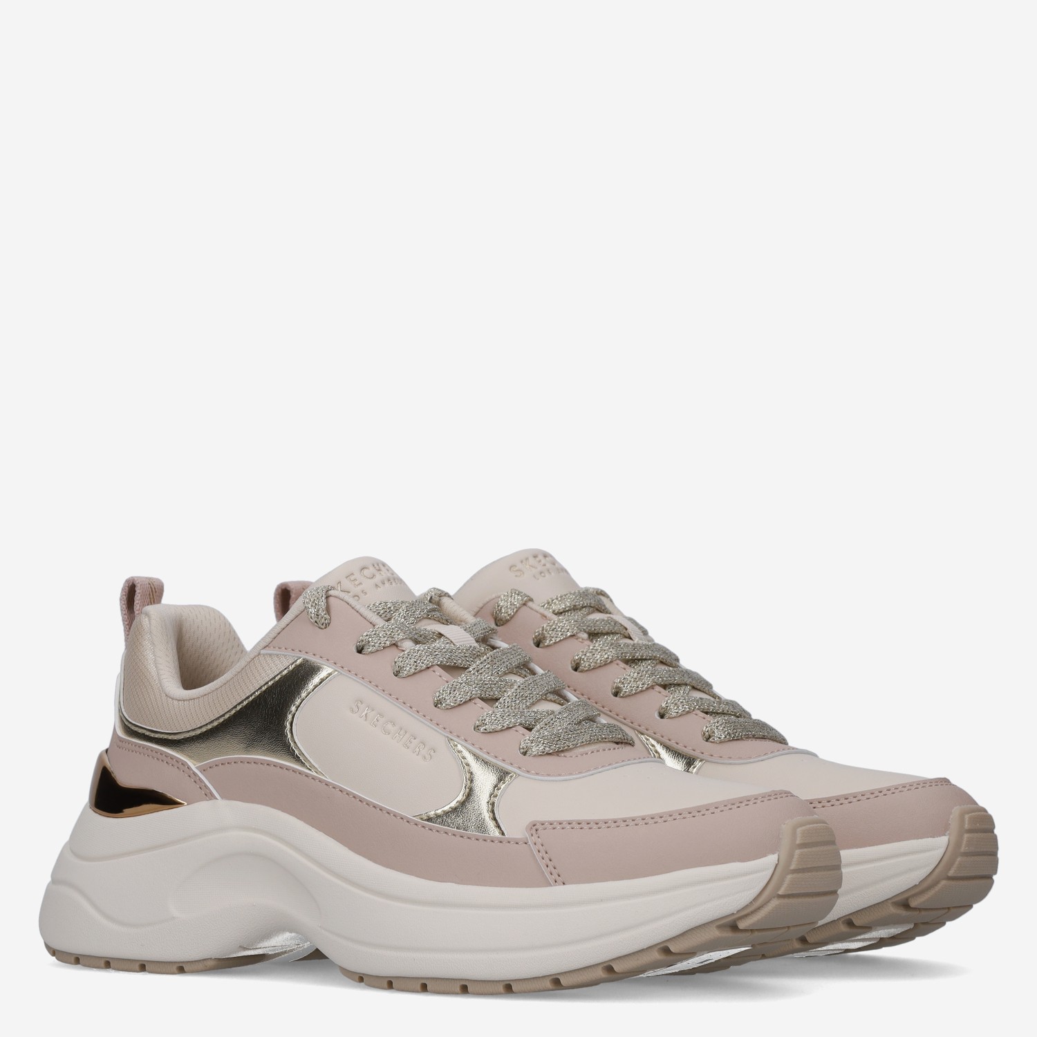 Deze beige Hazel damessneaker van Skechers is gemaakt van imitatieleer in combinatie met textiel en synthetische materialen. De sneaker is voorzien van metallic gouden accenten en heeft veters met glimmend draad.
