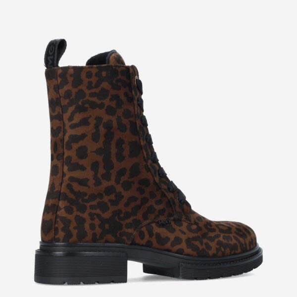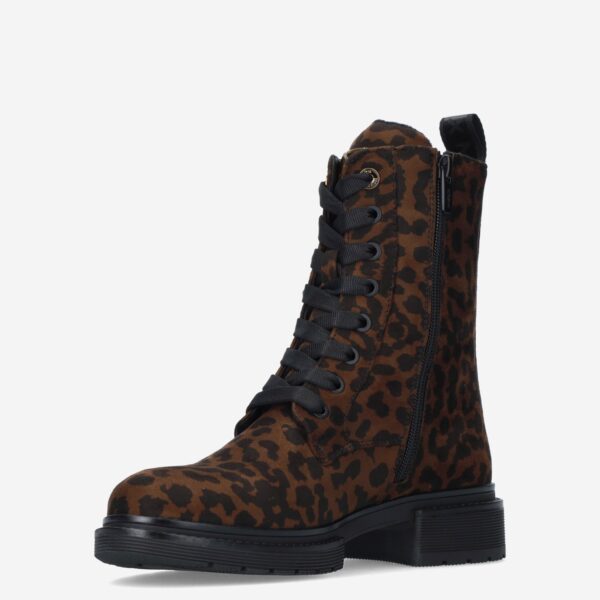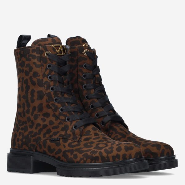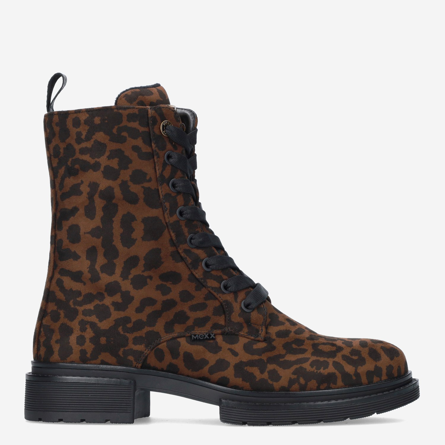 Deze bruine Holea damesboot van Mexx is gemaakt van imitatieleer in combinatie met synthetische materialen. De trendy boot is voorzien van een panterprint en heeft zowel een rits- als vetersluiting voor een gemakkelijke instap.