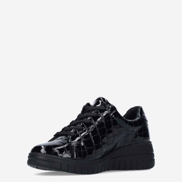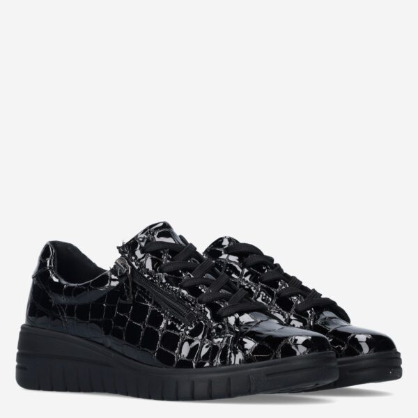 Deze zwarte Isla Croco damesschoen van Aco is gemaakt van leer in combinatie met synthetische materialen. De nette sneaker is voorzien van zowel een rits- als vetersluiting voor een gemakkelijke instap en heeft een lakleren-look.