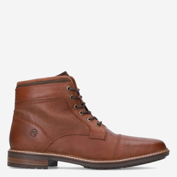 Deze bruine, cognac gekleurde Joni herenschoen van Poelman is gemaakt van leer in combinatie met textiel. De veterschoen is stijlvol afgewerkt.