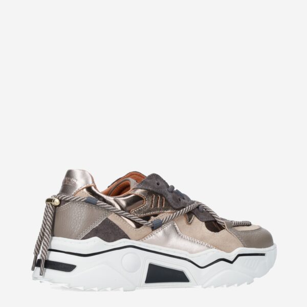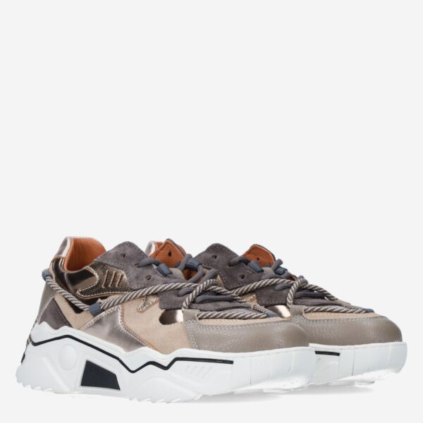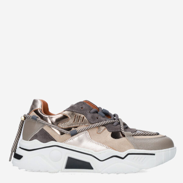 Deze beige Jupiter damessneaker van DWRS is gemaakt van verschillende leersoorten in combinatie met synthetische materialen. De sneaker is voorzien van een stevige zool en heeft metallic overlays.