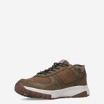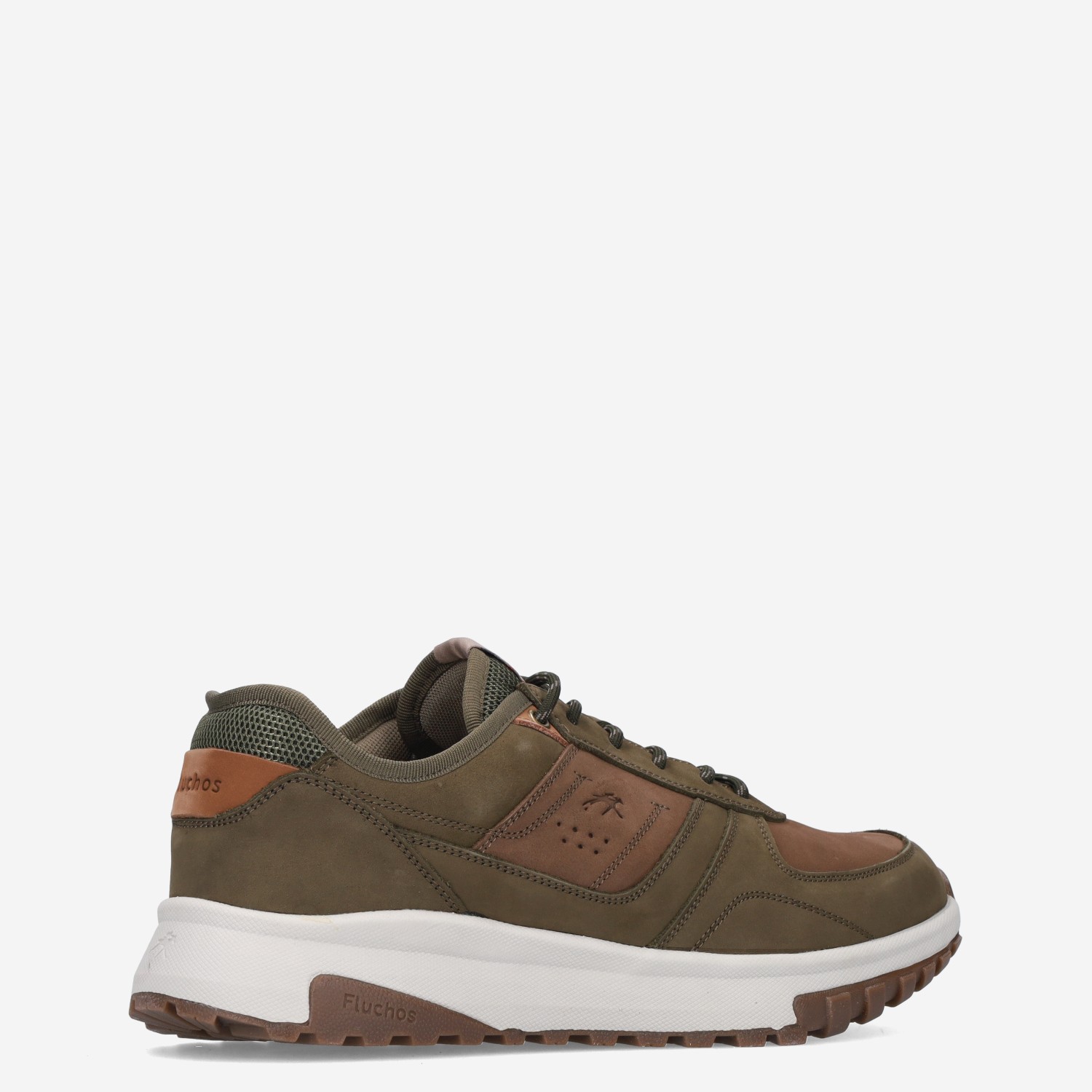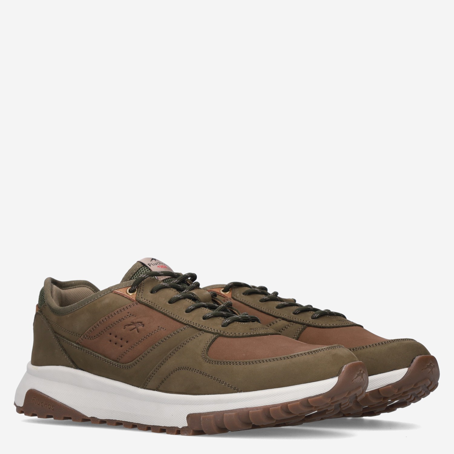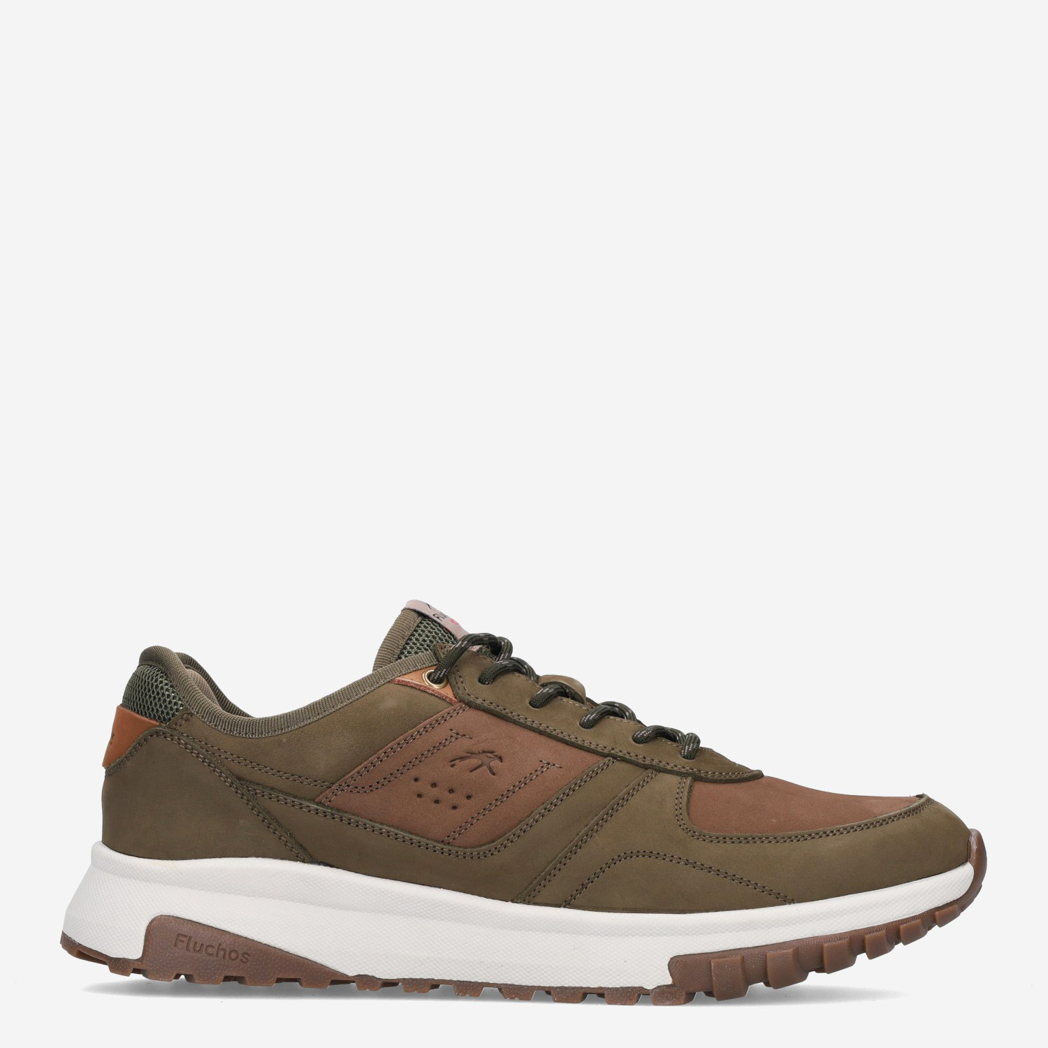 Deze donker groen met bruine Kansas herenschoen van Fluchos is gemaakt van hoogwaardig leer in combinatie met textiel. De comfortabele sneaker is voorzien van verschillende overlays.