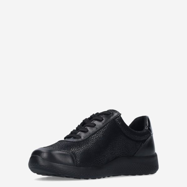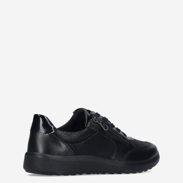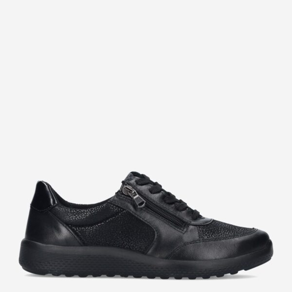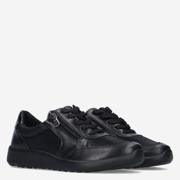 Deze zwarte Kira damessneaker van Aco is gemaakt van leer in combinatie met synthetische materialen. De sneaker is voorzien van zowel een rits- als vetersluiting voor een gemakkelijke instap.