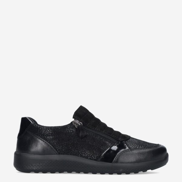 Deze zwarte Kira damessneaker van Aco is gemaakt van leer in combinatie met synthetische materialen. De sneaker is voorzien van een dubbele ritssluiting voor een gemakkelijke instap.