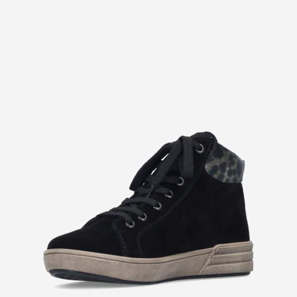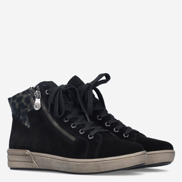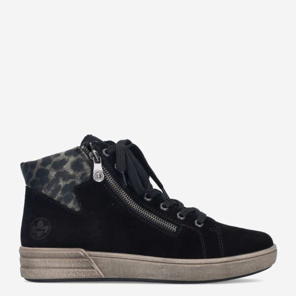 Deze zwarte Leodium damesschoen van Rieker is gemaakt van suรจde in combinatie met textiel. De hoge sneaker is voorzien van zowel een rits- als vetersluiting voor een gemakkelijke instap en heeft een panterprint design aan de bovenkant.