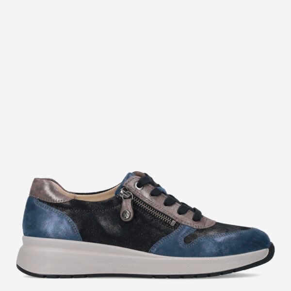 Deze zwart met blauwe Lisa Multi damessneaker van Fidelio is gemaakt van verschillende leersoorten en is voorzien van zowel een rits- als vetersluiting voor een gemakkelijke instap. Verder heeft de schoen een brede leest.