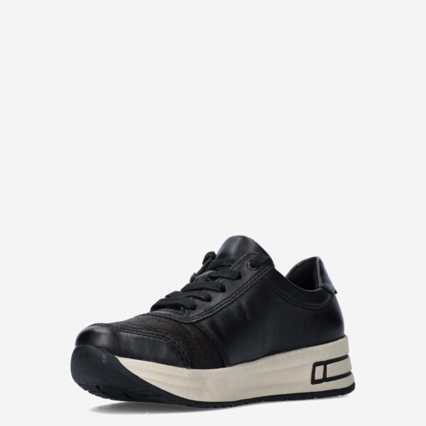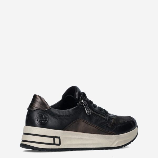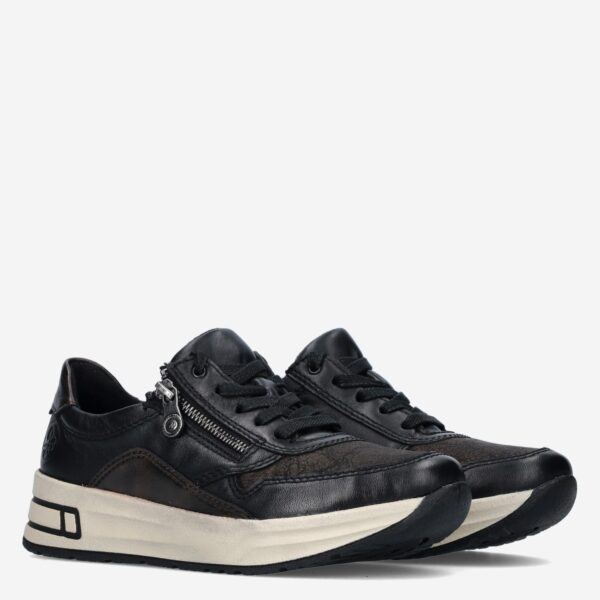 Deze zwarte Lugano damessneaker van Rieker is gemaakt van leer in combinatie met synthetische materialen. De hoge sneaker is voorzien van zowel een veter- als ritssluiting voor een gemakkelijke instap en heeft metallic accenten.