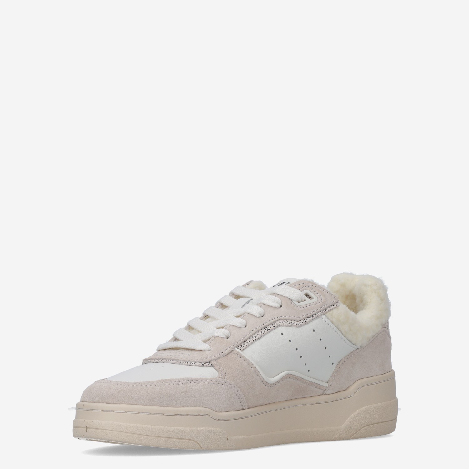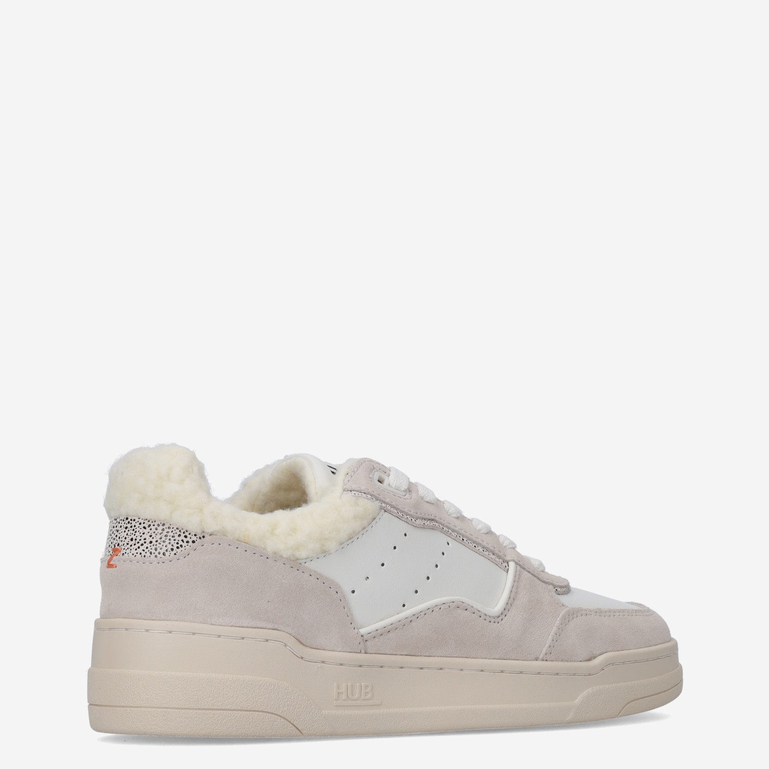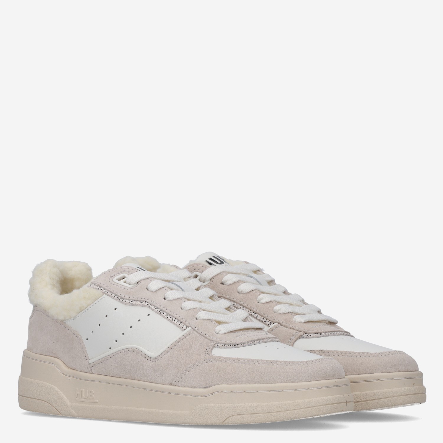 Deze offwhite, beige Match damessneaker van HUB is gemaakt van leer in combinatie met textiel en synthetische materialen. De sportieve sneaker is voorzien van een warme binnenvoering van teddystof.