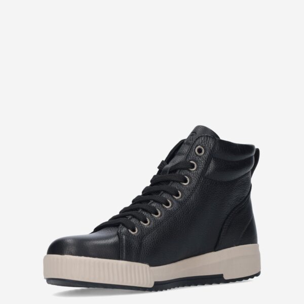 Deze zwarte Maya damessneaker van Rieker is gemaakt van leer in combinatie met synthetische materialen. De hoge sneaker is voorzien van zowel een rits- als vetersluiting voor een gemakkelijke instap.