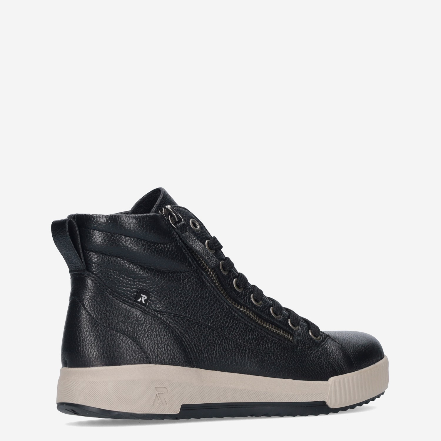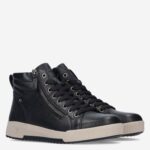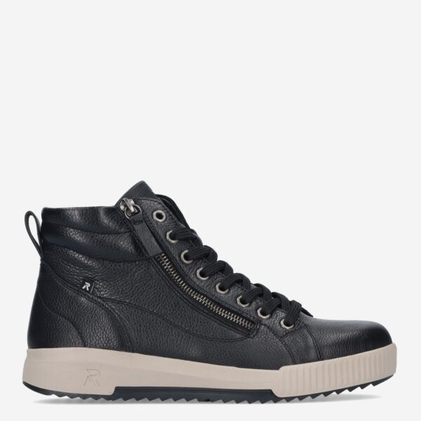 Deze zwarte Maya damessneaker van Rieker is gemaakt van leer in combinatie met synthetische materialen. De hoge sneaker is voorzien van zowel een rits- als vetersluiting voor een gemakkelijke instap.
