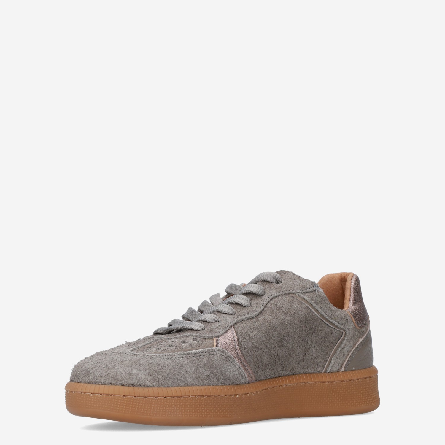 Deze grijze Mirabel damessneaker van DWRS is gemaakt van verschillende leersoorten in combinatie met synthetische materialen. De sportieve schoen is voorzien van geperforeerd leer en heeft metallic accenten.