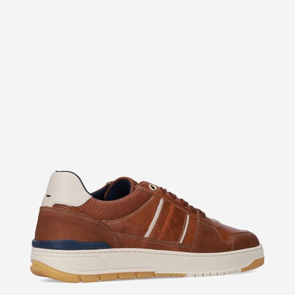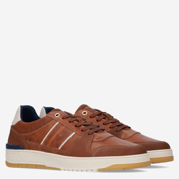 Deze bruine Mount herensneaker van Berkelmans is gemaakt van leer. De nette sneaker is voorzien van geperforeerd leer en heeft blauwe accenten.