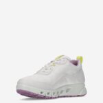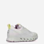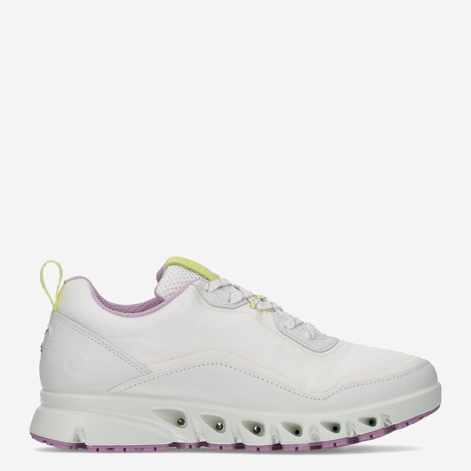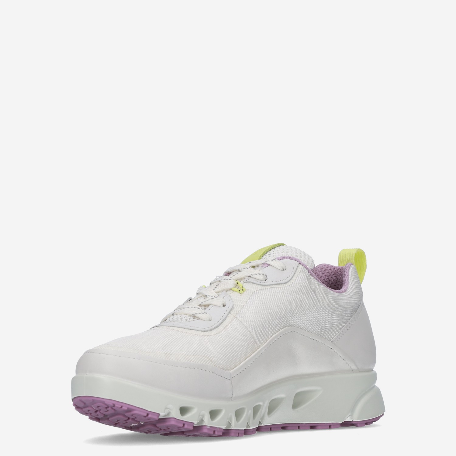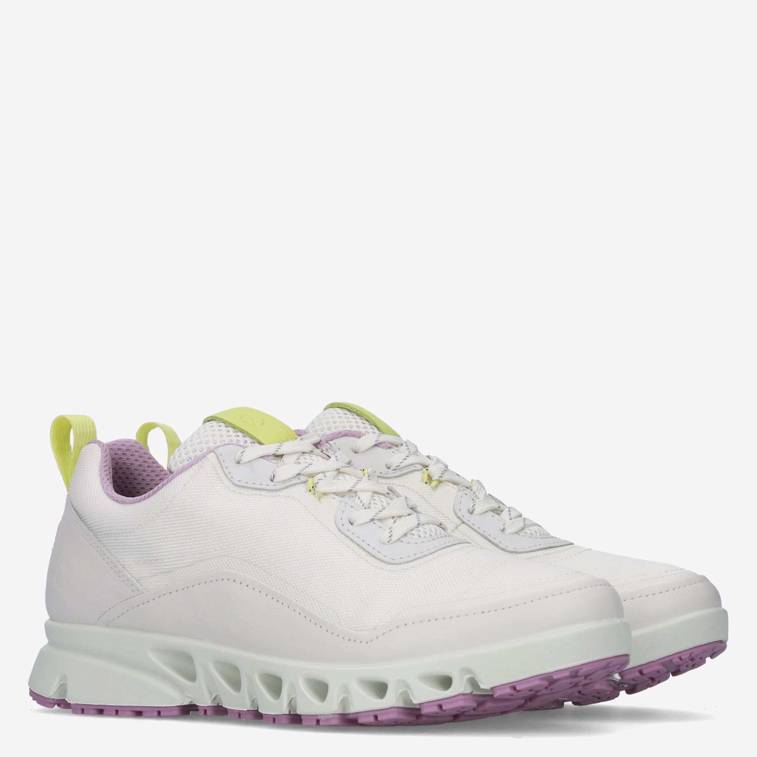 Deze witte Multi-Vent W damesschoen van ECCO is gemaakt van hoogwaardig leer in combinatie met textiel en synthetische materialen. De schoen is voorzien van een roze loopzool en heeft gele accenten.