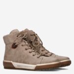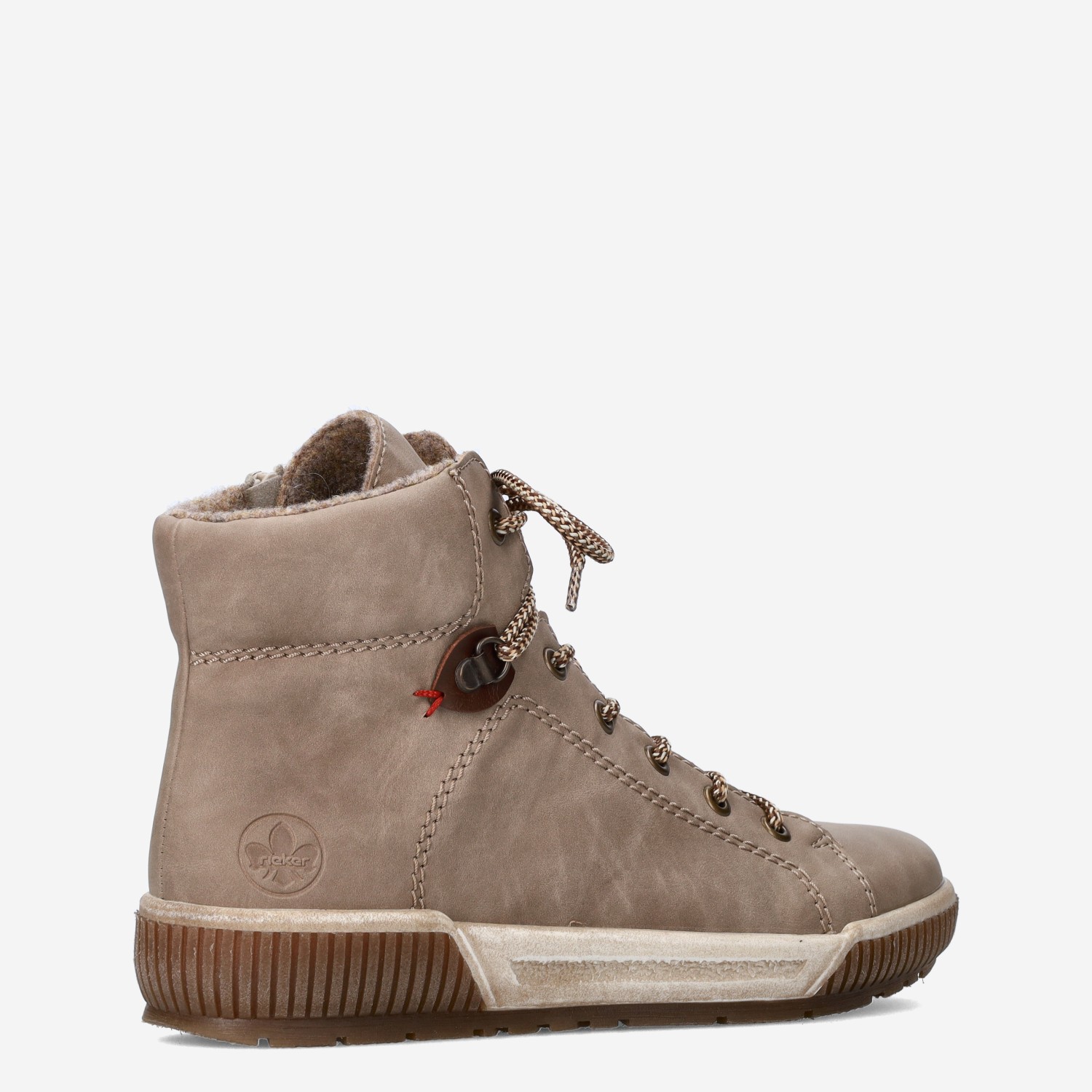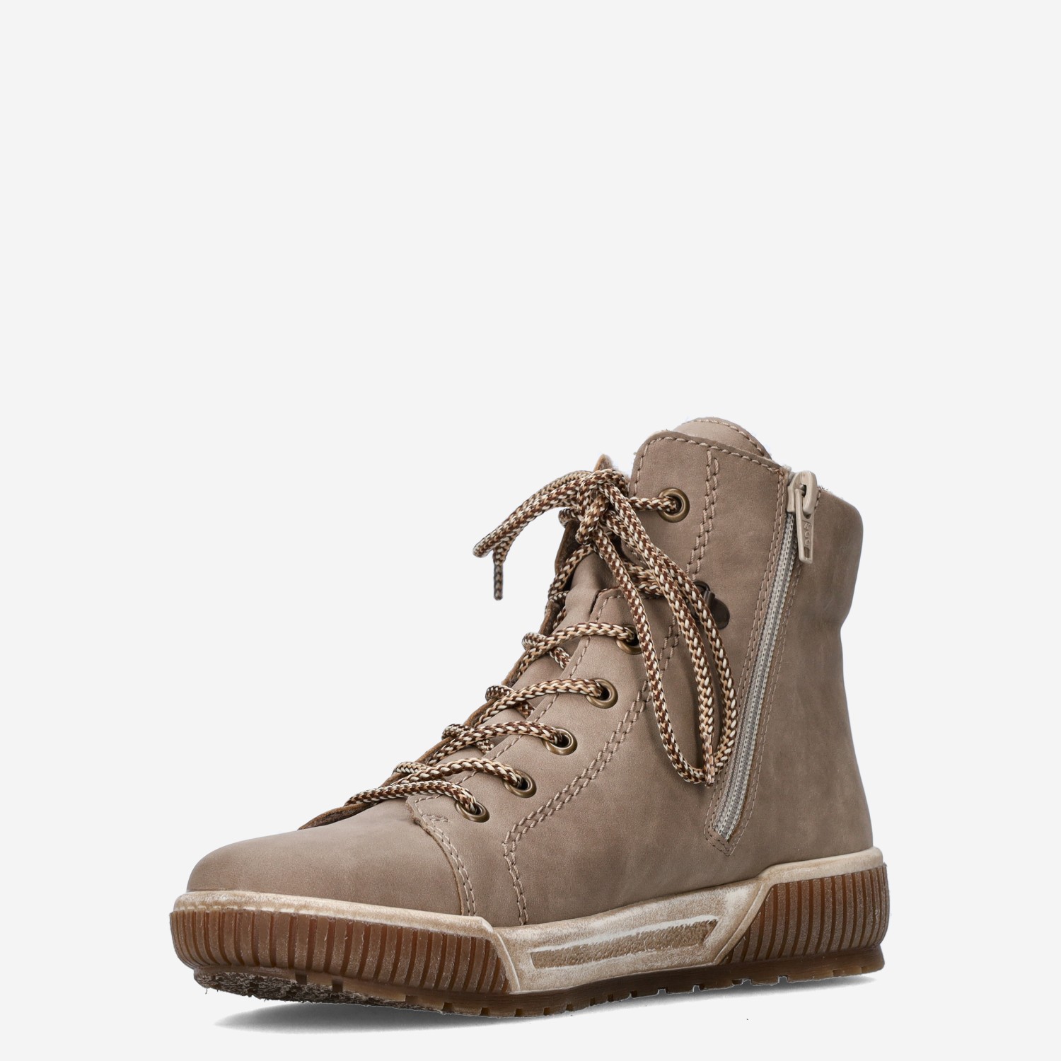 Deze beige Nabukino Ambor damessneaker van Rieker is gemaakt van imitatieleer in combinatie met synthetische materialen. De hoge sneaker is voorzien van zowel een veter- als ritssluiting voor een gemakkelijke instap en heeft een zachte binnenvoering.
