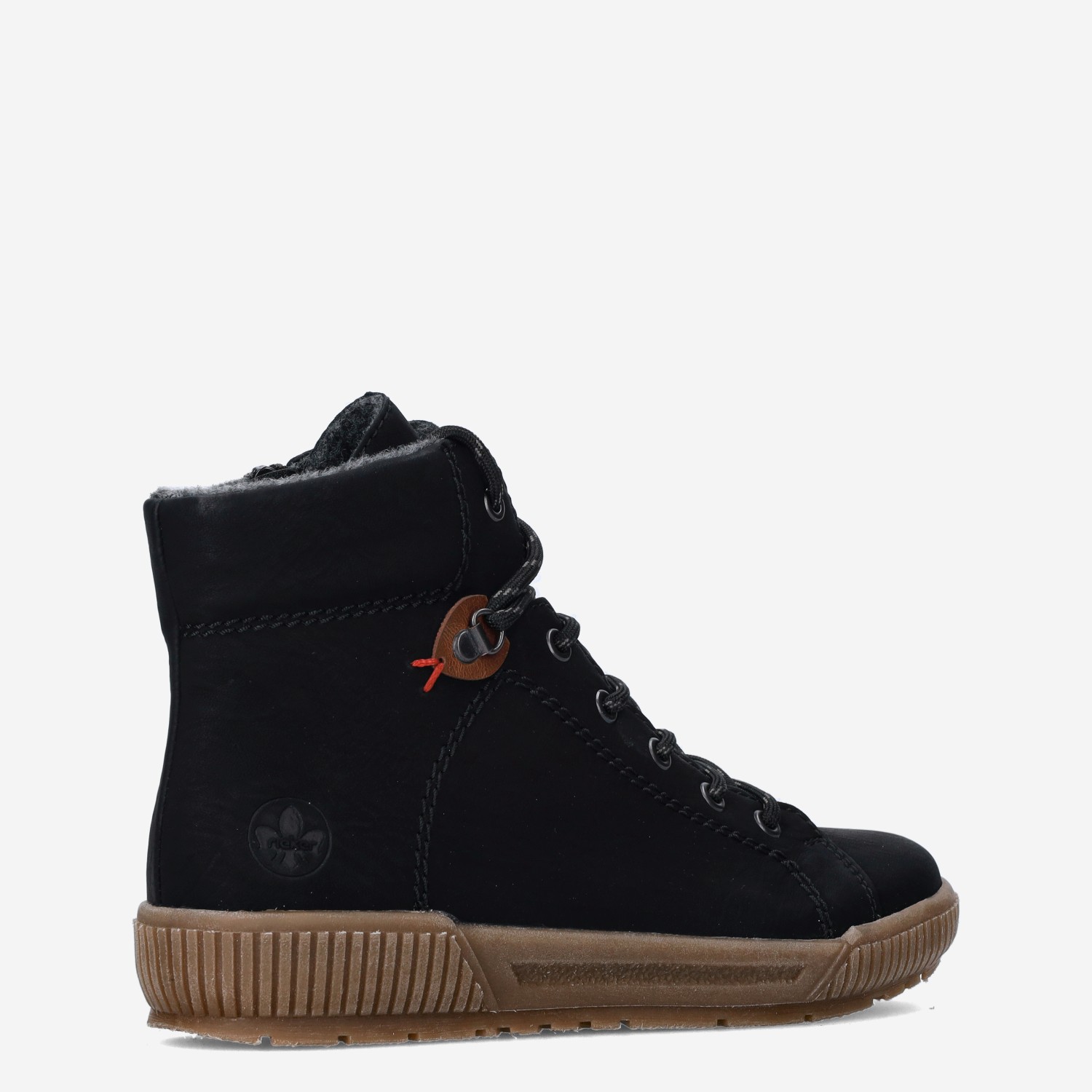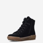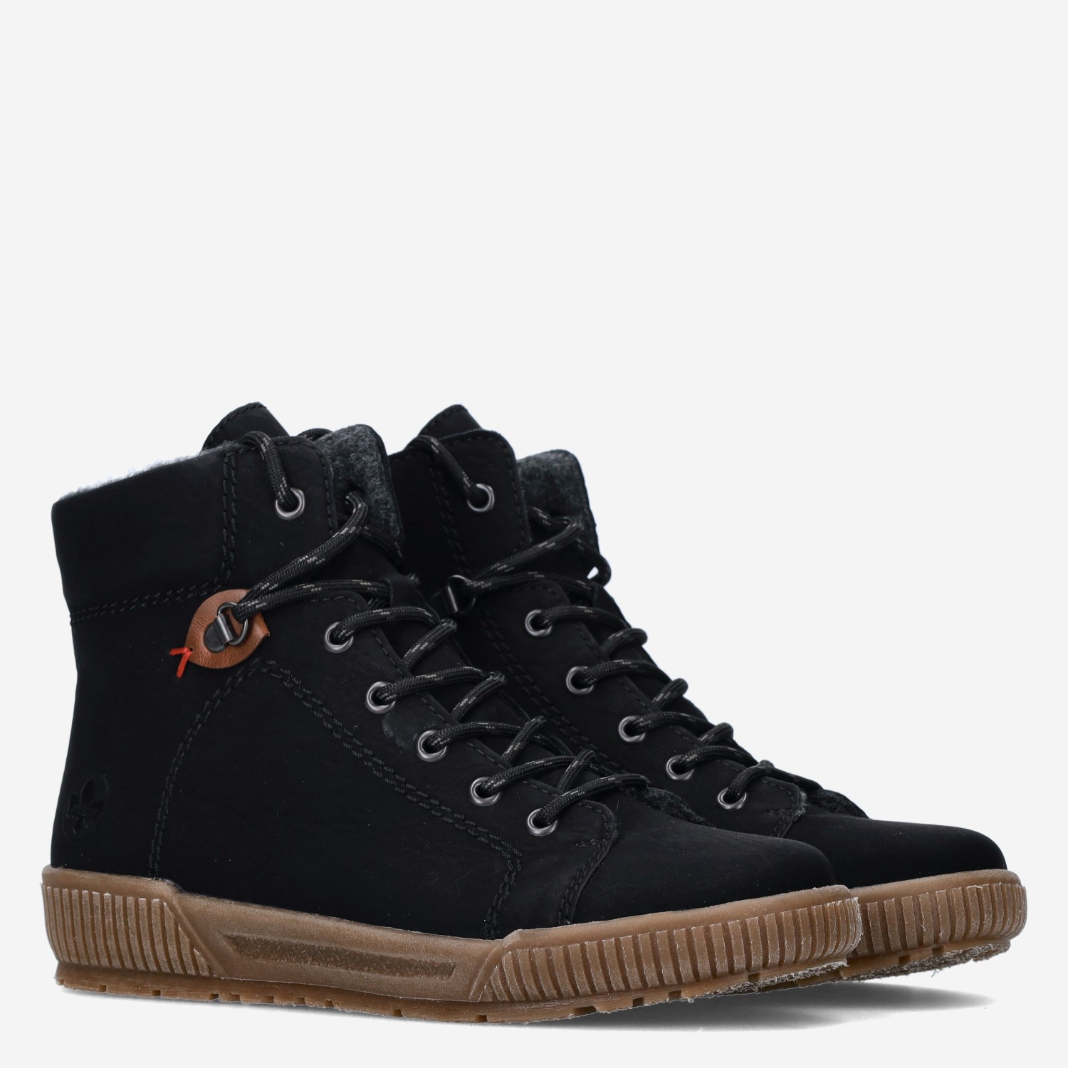 Deze zwarte Nabukino Ambor damessneaker van Rieker is gemaakt van imitatieleer in combinatie met synthetische materialen. De hoge sneaker is voorzien van zowel een veter- als ritssluiting voor een gemakkelijke instap en heeft een zachte binnenvoering.