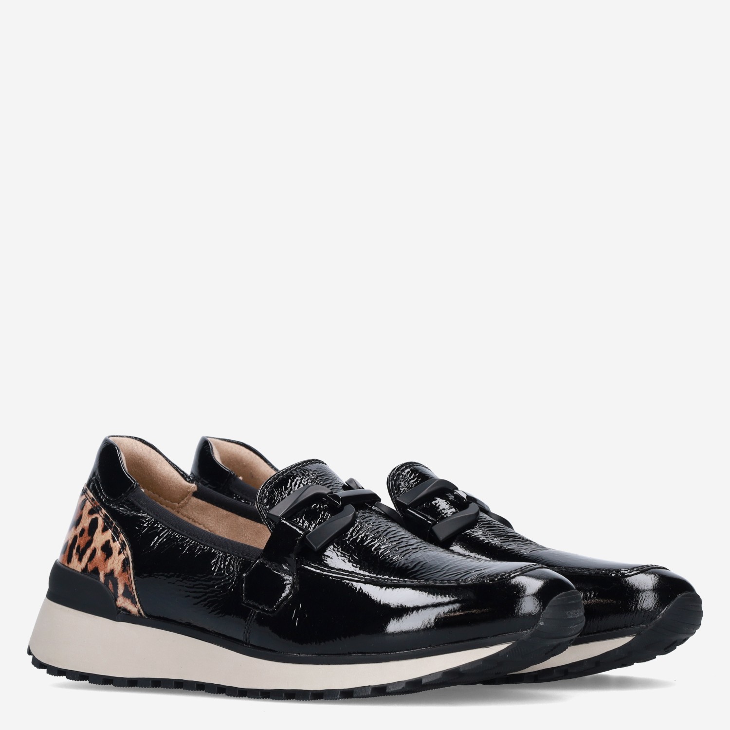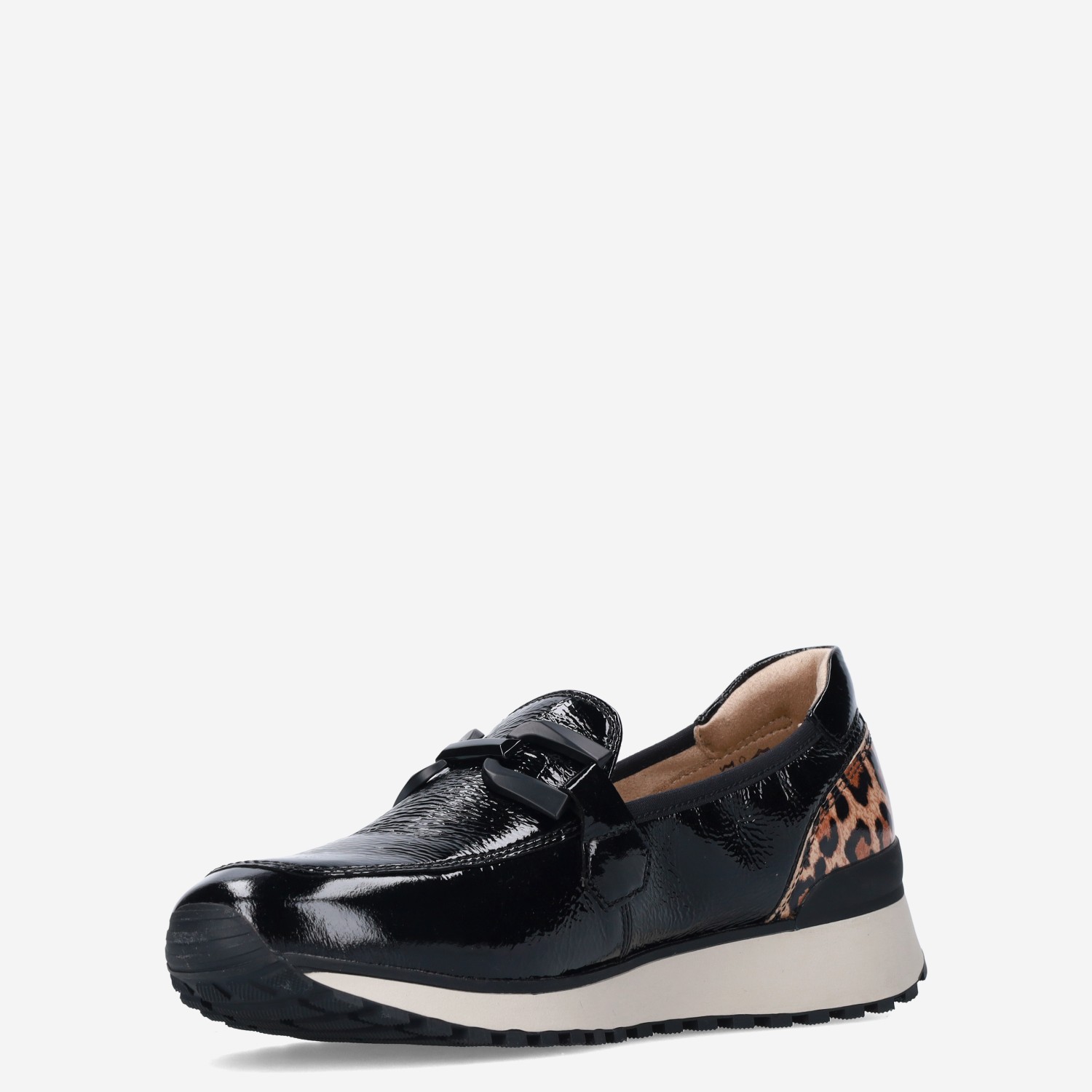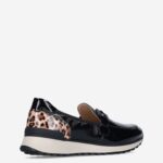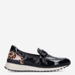 Deze zwarte Naplak damesloafer van Caprice is gemaakt van leer in combinatie met synthetische materialen. De instapper is voorzien van een panterprint design en heeft een lakleren-look.