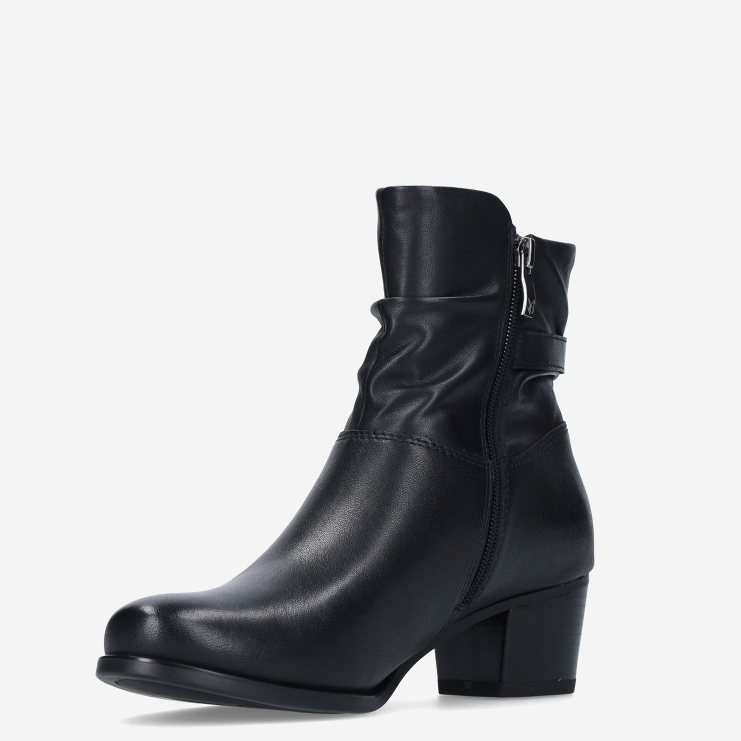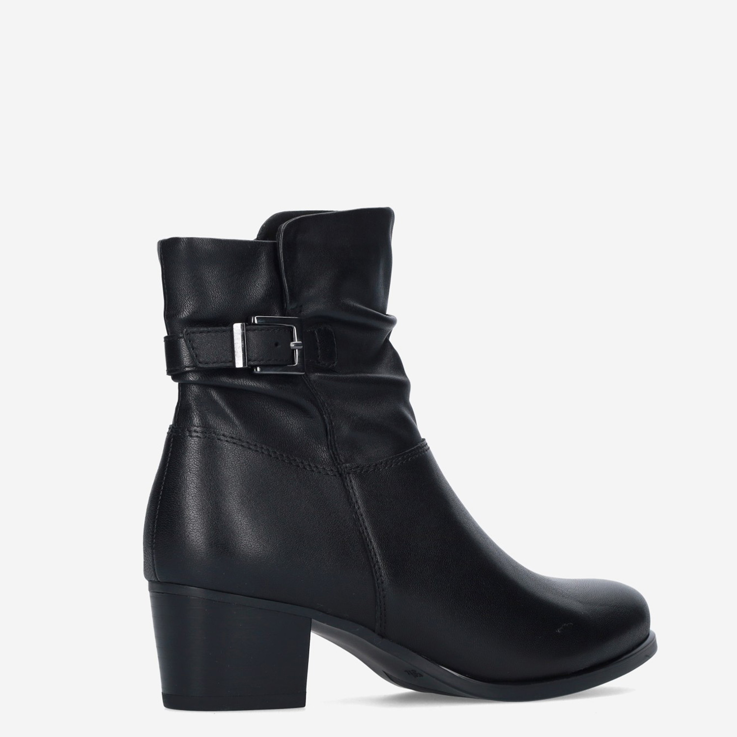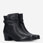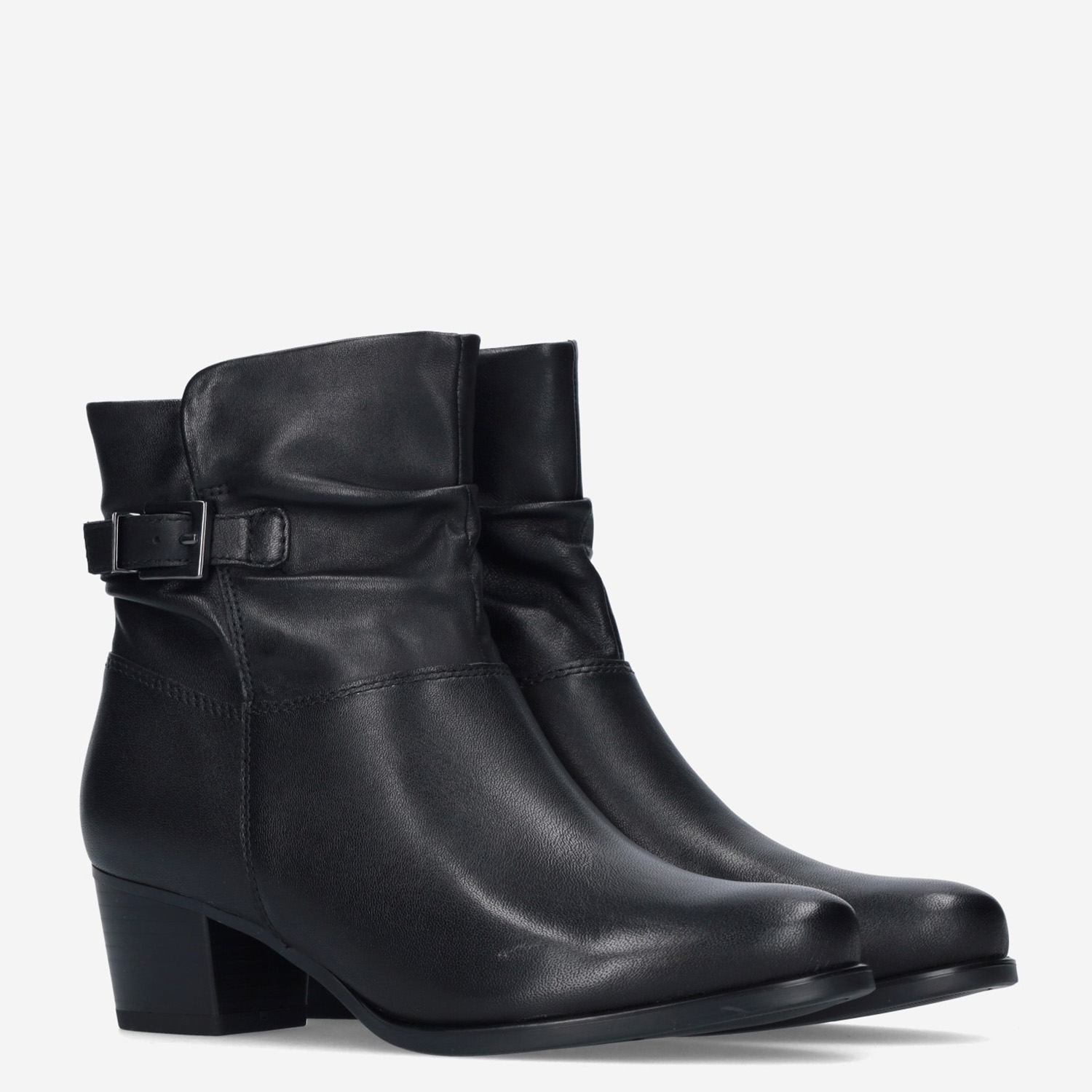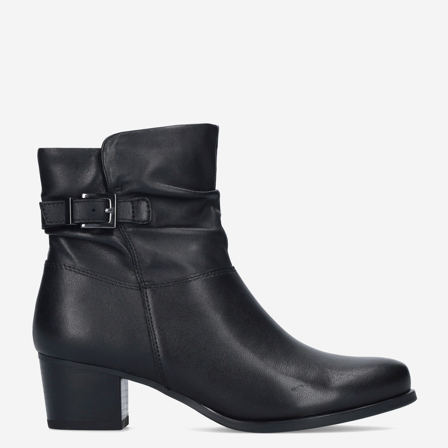 Deze zwarte Nappa damesboot van Caprice is gemaakt van leer en heeft een hakhoogte van ongeveer 4 centimeter. Het enkellaarsje is voorzien van een ritssluiting en decoratieve gespsluiting.