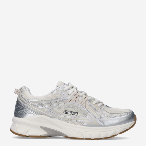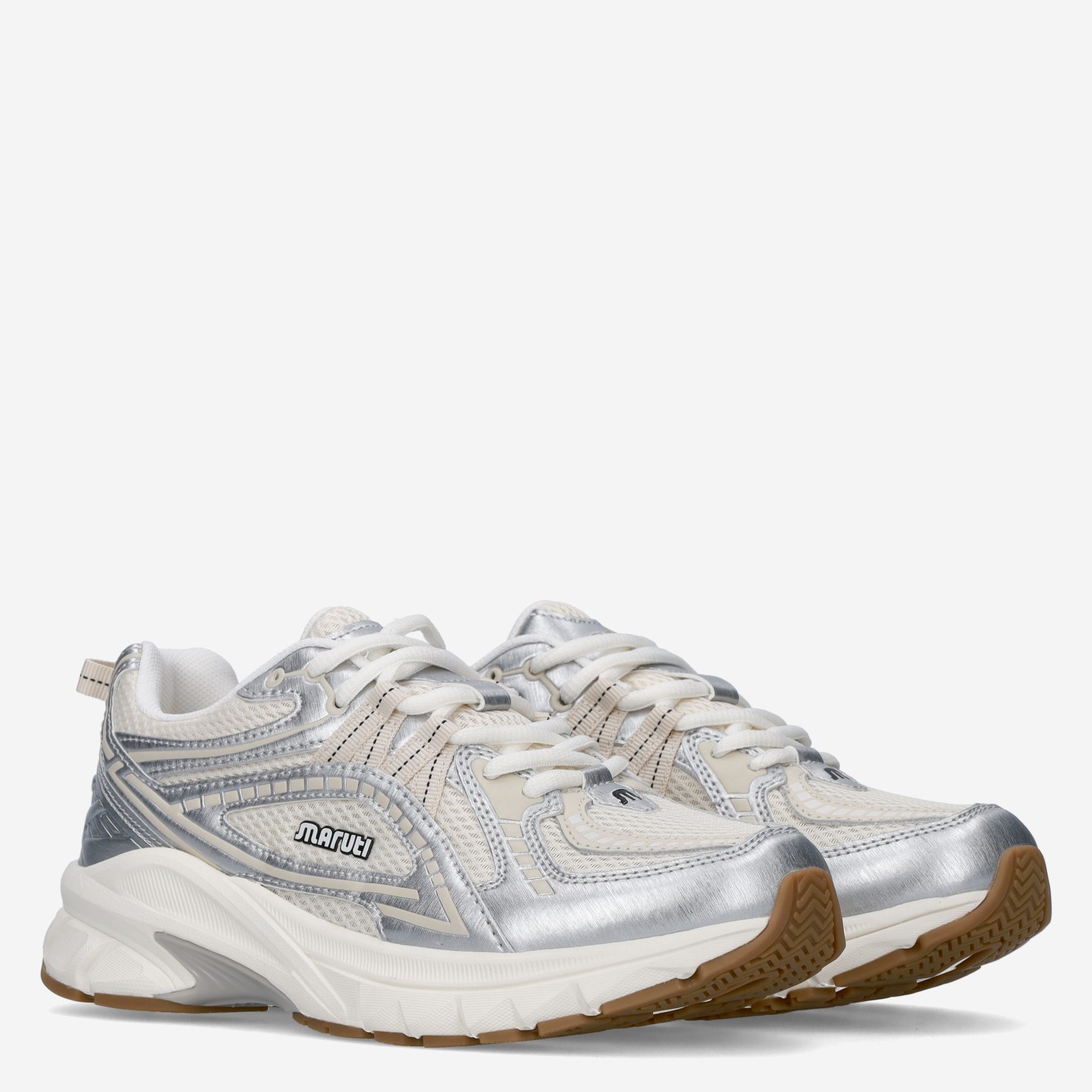 Deze wit met zilveren Nola Silver damessneaker van Maruti is gemaakt van leer in combinatie met textiel. De sportieve sneaker heeft een frisse uitstraling en is voorzien van een fijne loopzool.