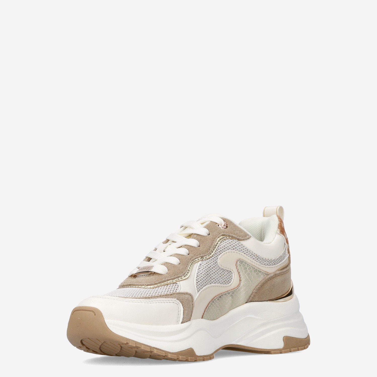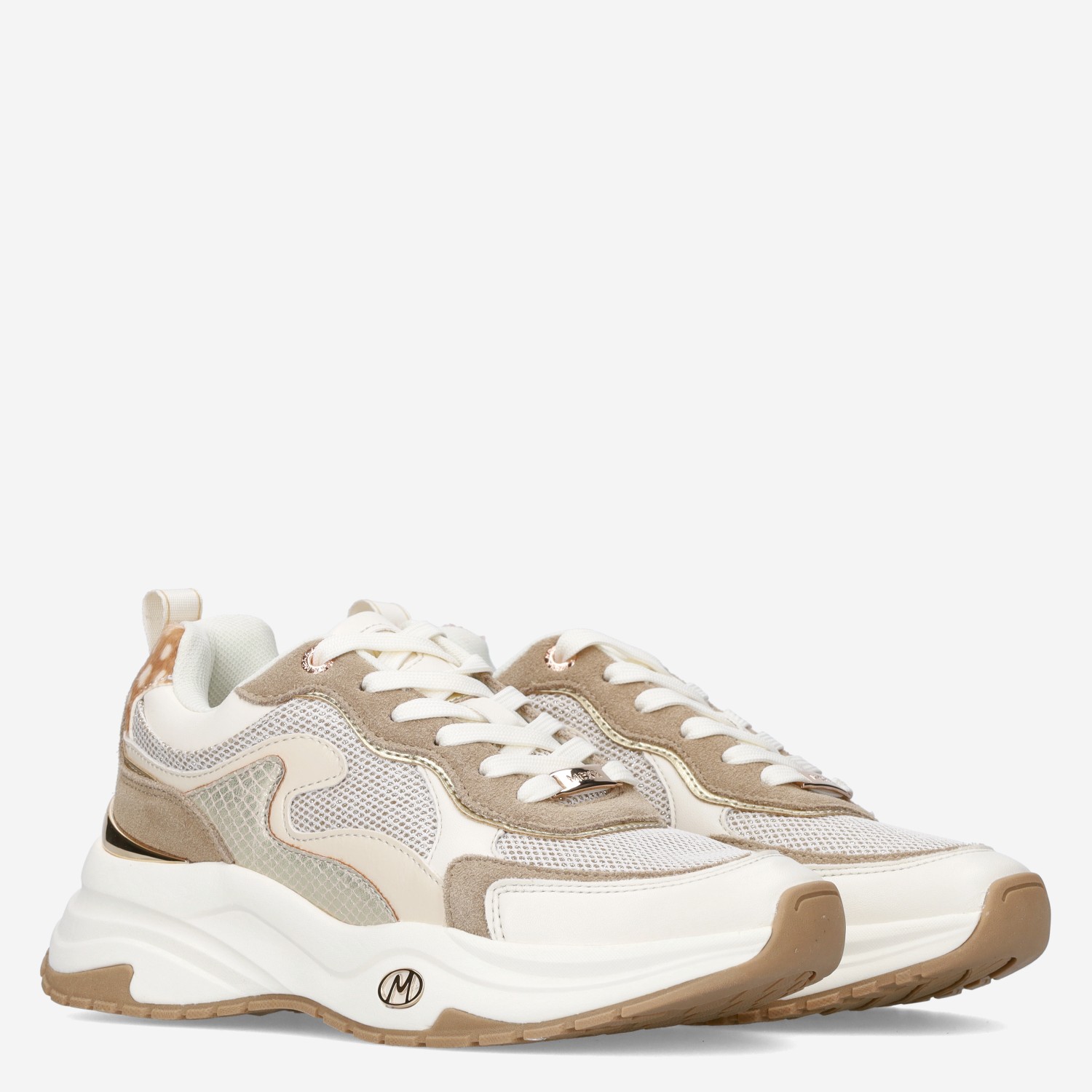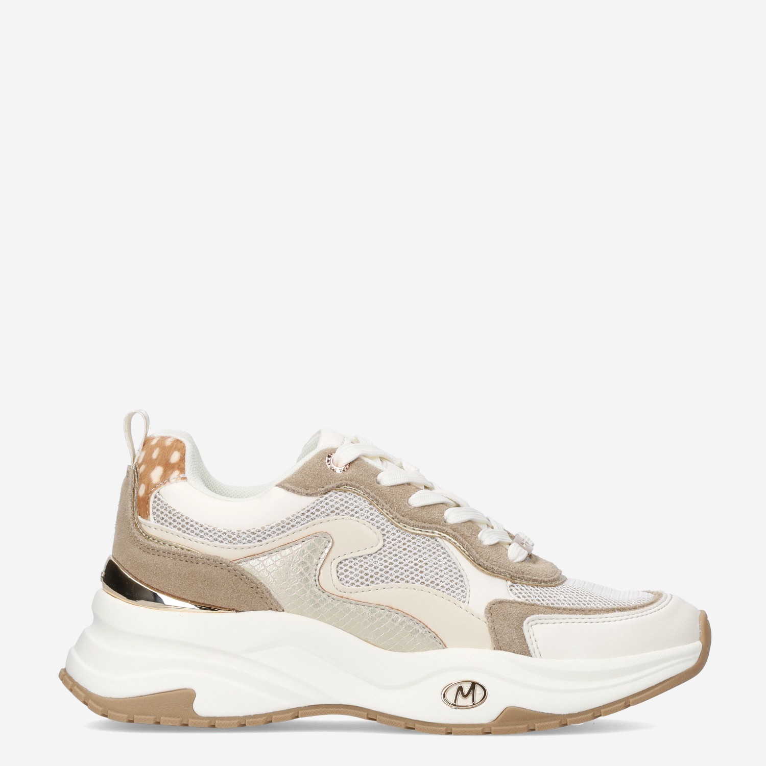 Deze beige met witte Palma Ora damessneaker van Mexx is gemaakt van imitatieleer en heeft een chunky loopzool. De trendy sneaker is voorzien van metallic accenten en heeft op het hielstuk een bambiprint design.