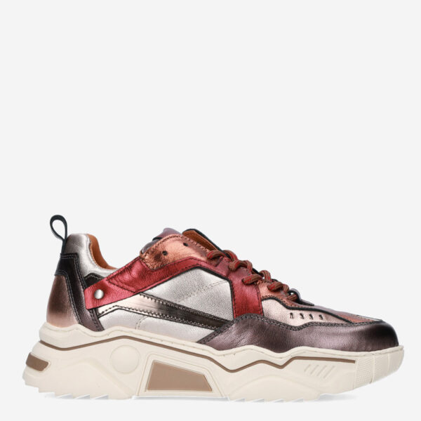 Deze bordeaux , offwhite Pluto damessneaker van DWRS is gemaakt van verschillende leersoorten in combinatie met synthetische materialen. De sportieve schoen is voorzien van een stevige zool en heeft metallic overlays.