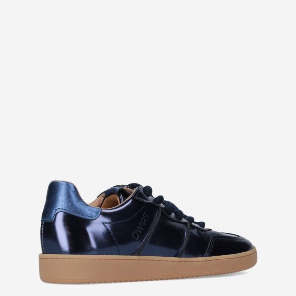 Deze blauwe metallic Poona damessneaker van DWRS is gemaakt van verschillende leersoorten in combinatie met synthetische materialen. De sneaker is voorzien van een lage sportieve zool en heeft dikke veters.