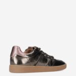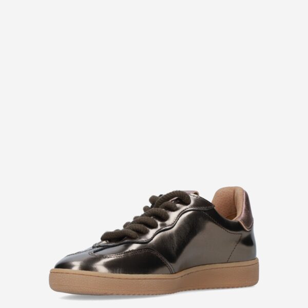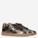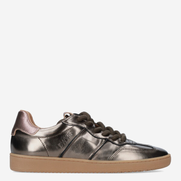 Deze bruine metallic Poona damessneaker van DWRS is gemaakt van verschillende leersoorten in combinatie met synthetische materialen. De sneaker is voorzien van een lage sportieve zool en heeft dikke veters.