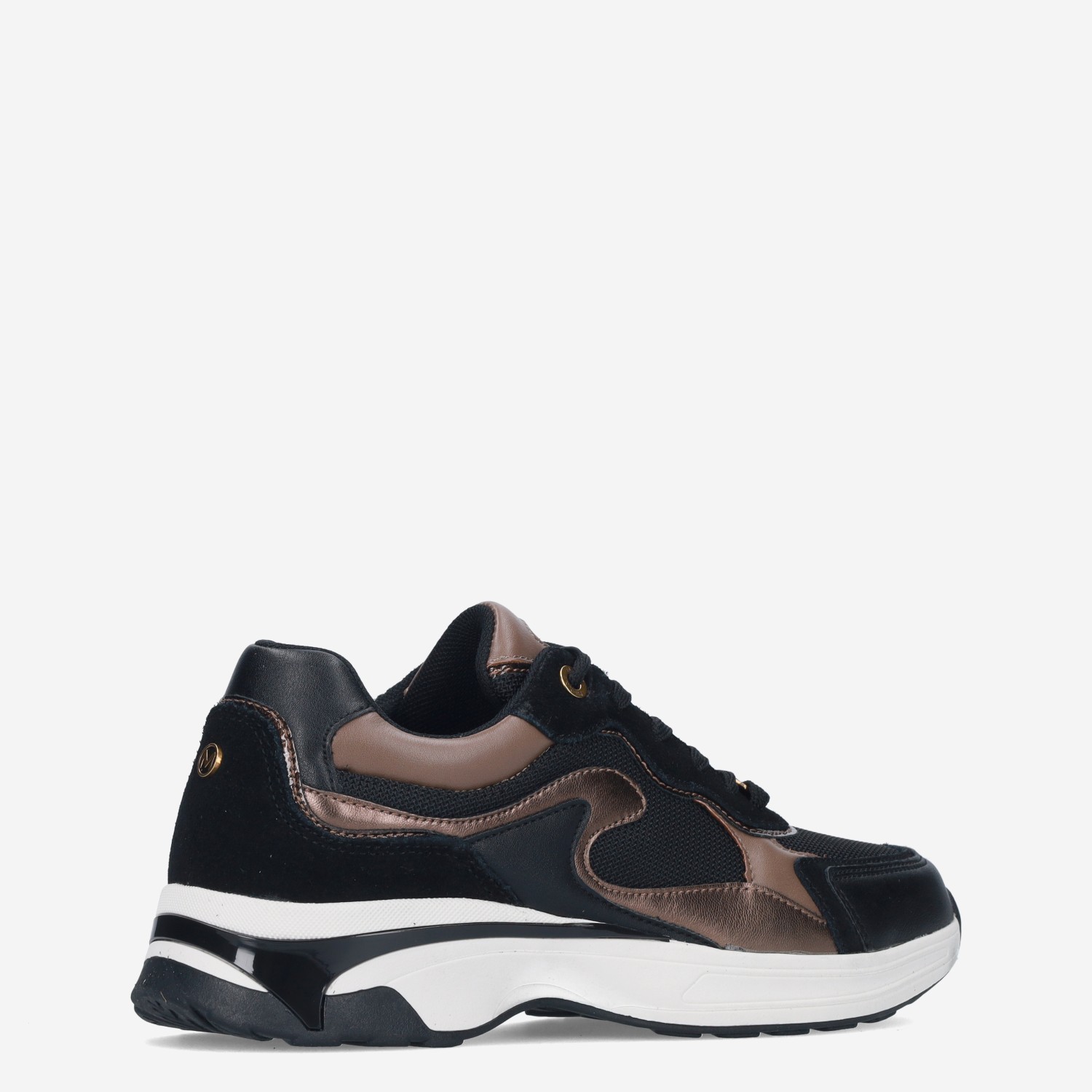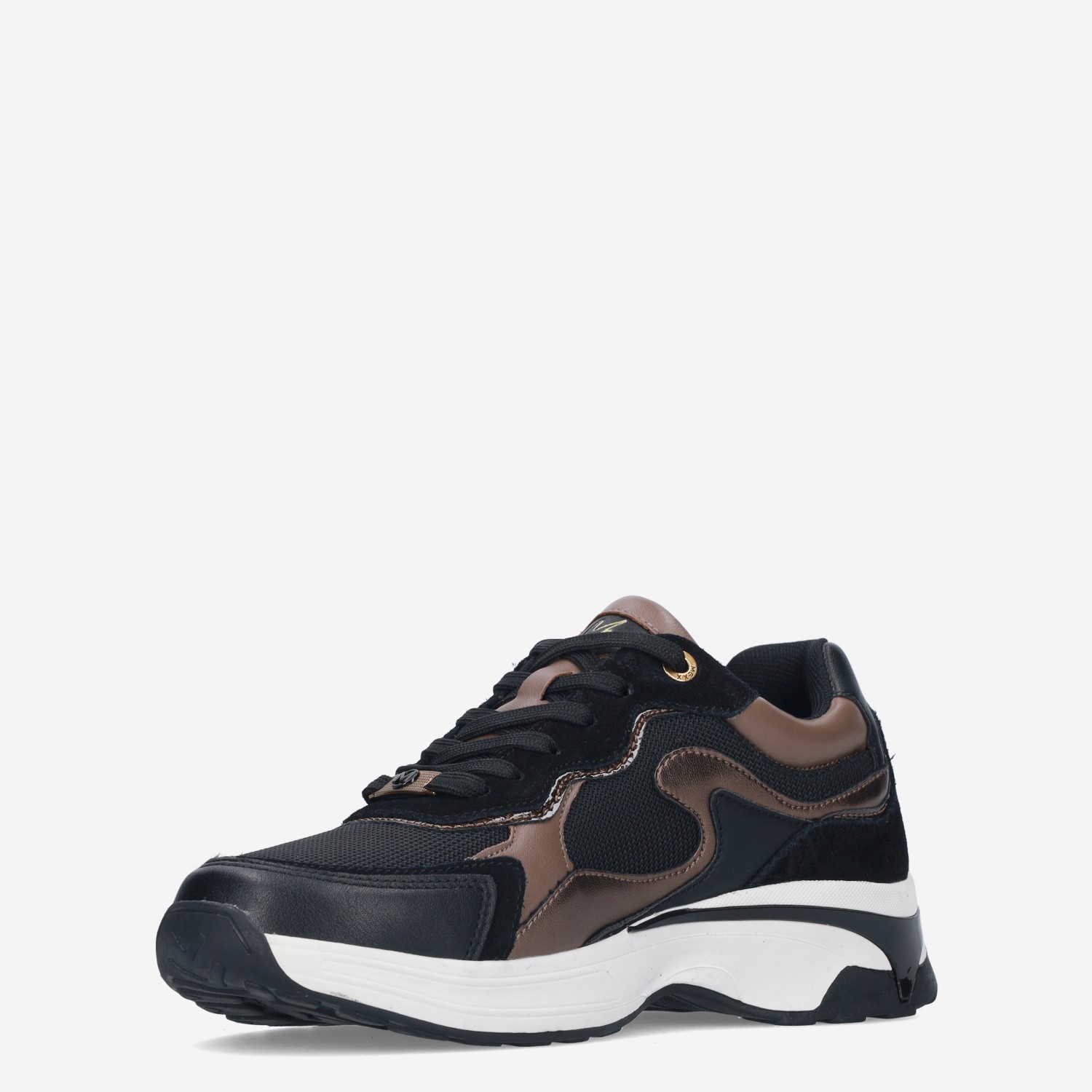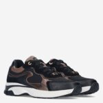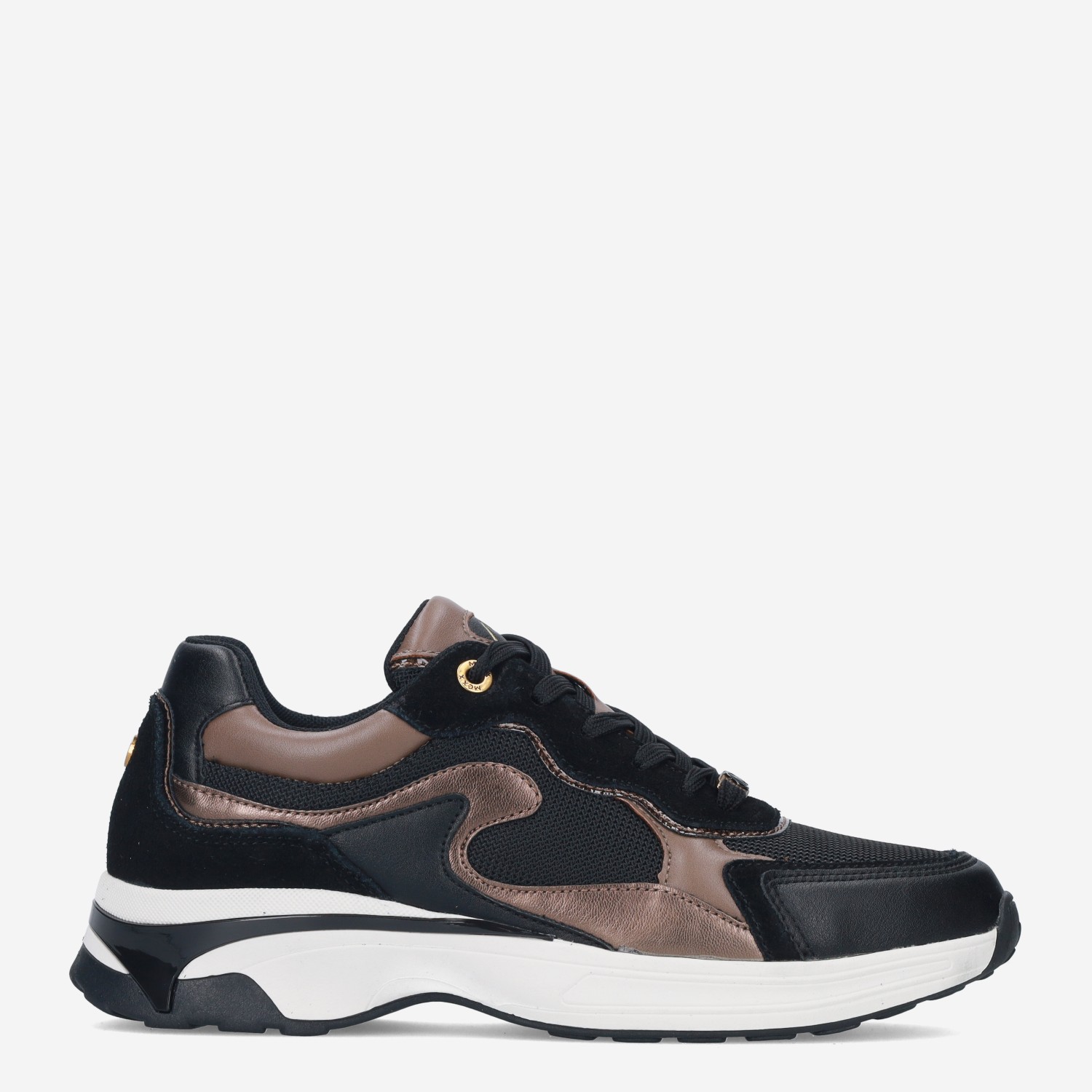 Deze zwart met bruine Portia Love damessneaker van Mexx is gemaakt van imitatieleer en is voorzien van textured overlays.