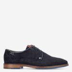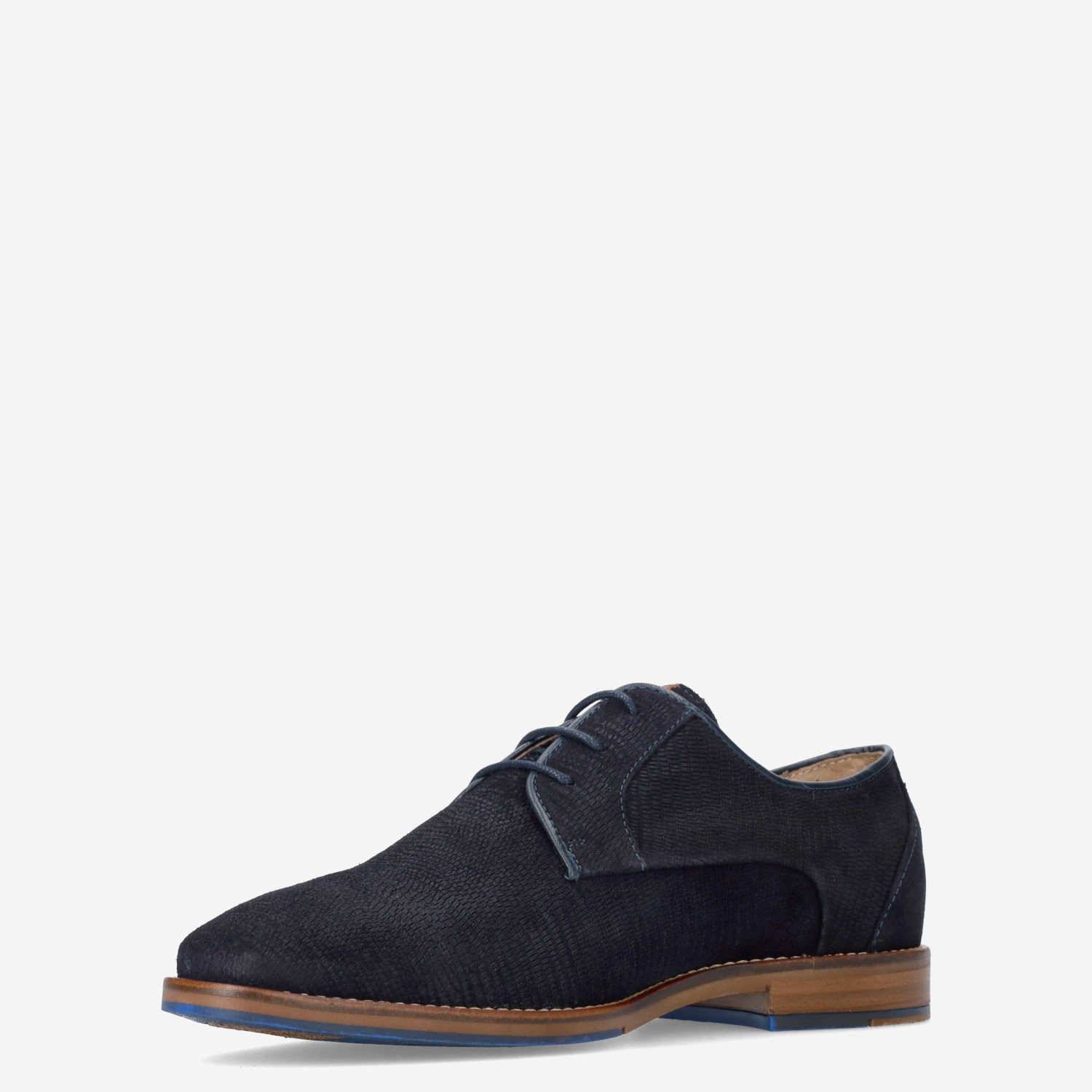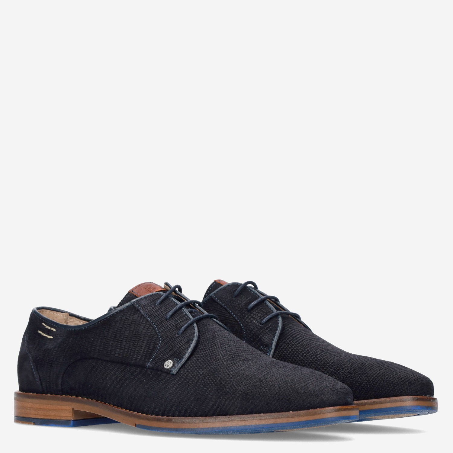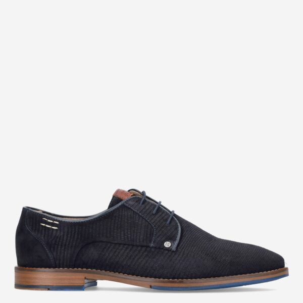 Deze blauwe Posadas herenschoen van Berkelmans is gemaakt van suède. De nette schoen is voorzien van een reliëfstuctuur en heeft opvallende blauwe details op de zool.