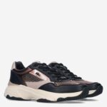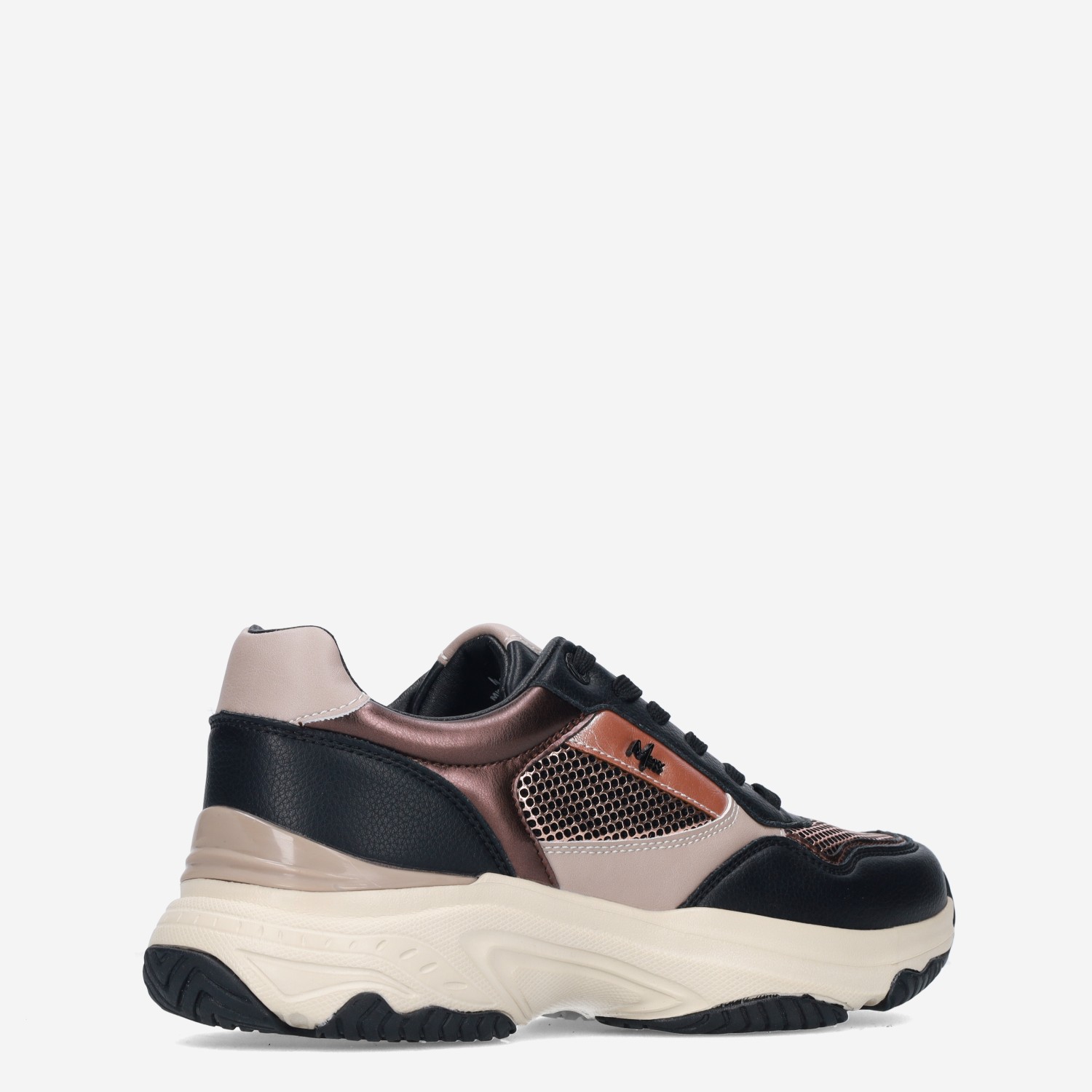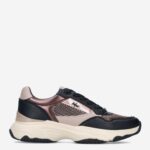 Deze beige met zwarte Radja Pax damessneaker van Mexx is gemaakt van imitatieleer en is voorzien van metallic accenten.