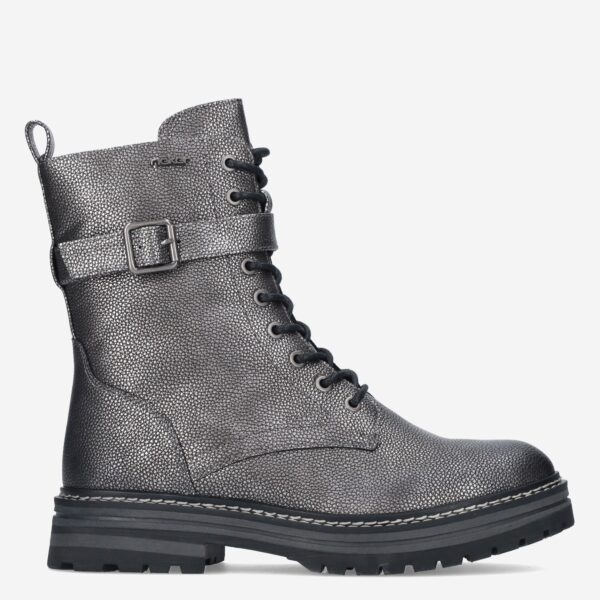 Deze zilveren Rangun damesboot van Rieker is gemaakt van imitatieleer in combinatie met textiel en synthetische materialen. De boot is voorzien van zowel een rits- als vetersluiting voor een gemakkelijke instap en heeft een metallic print.