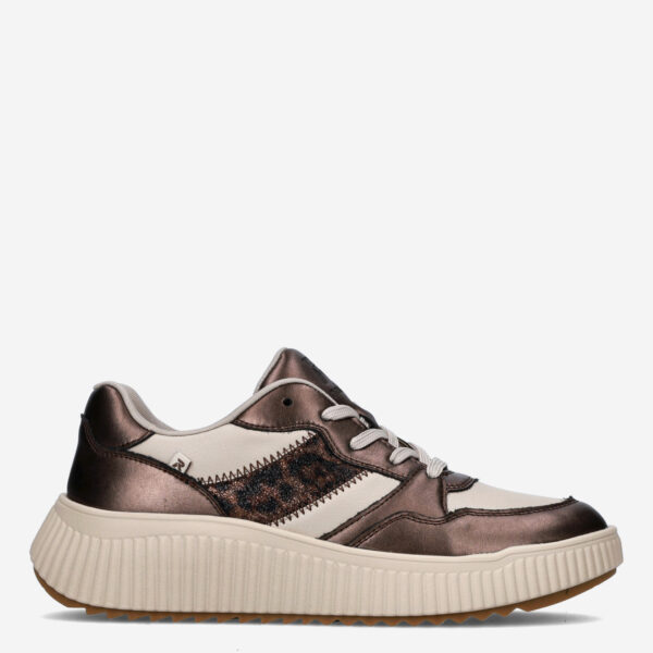 Deze beige, metallic bruine Rock damessneaker van Rieker is gemaakt van leer in combinatie met synthetische materialen. De sneaker is voorzien van een sportieve zool en heeft metallic accenten.